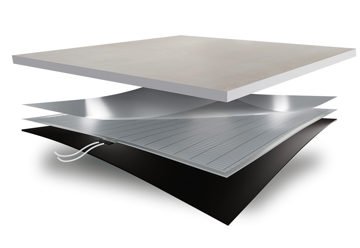Auch die elektrischen Heizmodule von »TerraMaxx Comfort« sind selbstklebend – sie lassen sich einfach und problemlos auf der Unterseite des Plattenbelages aufbringen. An diesen Stellen werden die Beläge dann erwärmt. »Die Heizfolie liefert aber immer nur so viel Energie, wie benötigt wird«, betont Gutjahr-Produktmanager Römer. »Zudem reguliert sie sich selbst, um die Temperatur konstant auf 24 °C zu halten. Das optimiert den Energieverbrauch.«