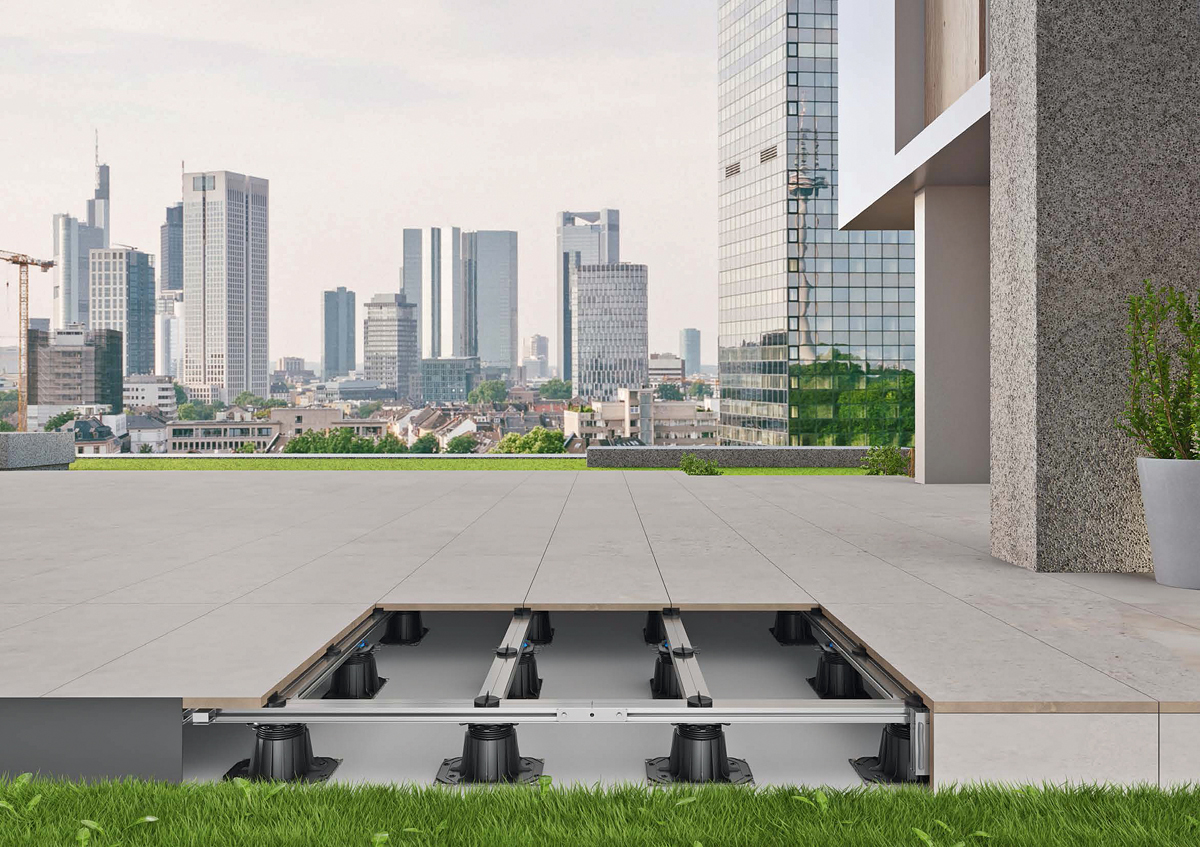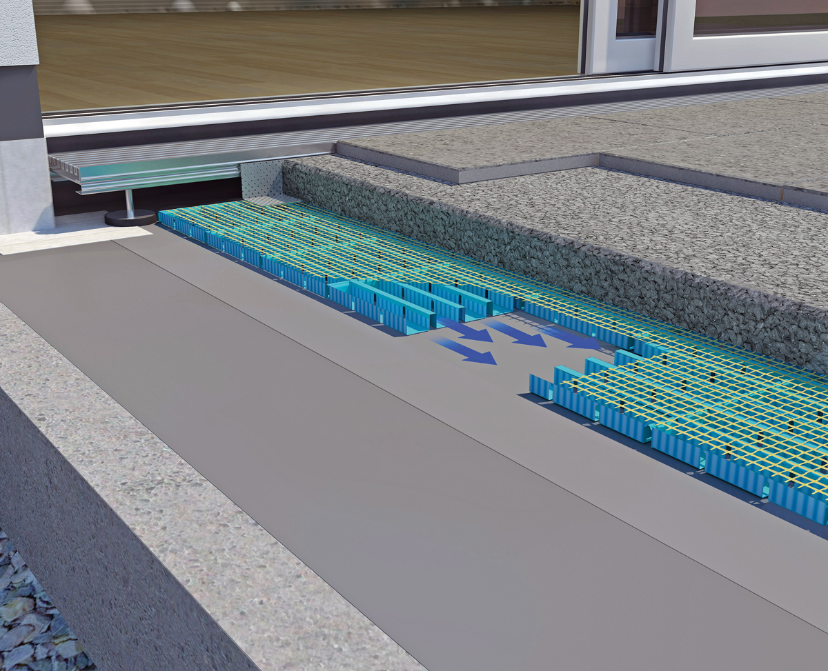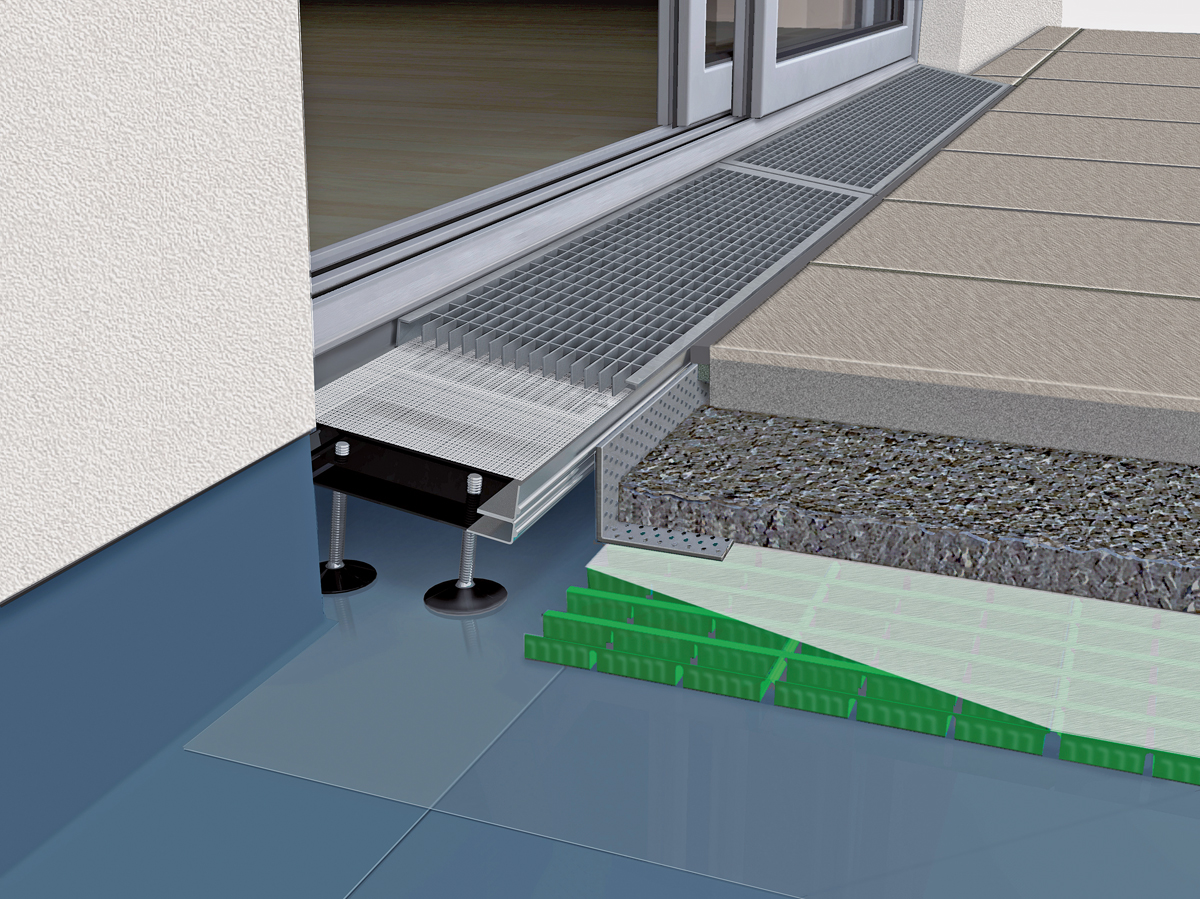 Bei der Gestaltung hochwertiger Balkone und Terrassen wünschen sich viele schwellenfreie Übergänge. Doch die technische Umsetzung ist oft kniffelig – und die Normen schreiben im Türanschlussbereich eine ausreichende Entwässerung durch Drainageroste vor. Genau für diesen Einsatzbereich hat Gutjahr das Komplettsystem aus »AquaDrain Flex«-Drainrosten und passenden Flächendrainagen entwickelt. Die bauseits ablängbaren Drainroste werden vor Balkon- und Terrassentüren oder vor bodentiefen Fenstern eingebaut. Damit sind regelgerechte barrierefreie Türanschlüsse einfach und sicher umzusetzen.