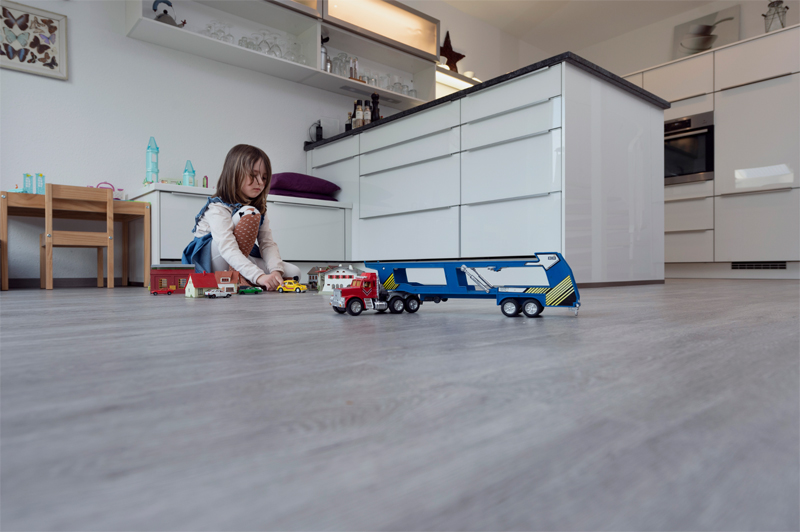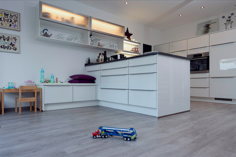 Gefragt war eine flexible Lösung. Diese musste den Ansprüchen in einem Nassraum wie der großen Küche gerecht werden, aber auch zusammen mit einem Designboden funktionieren. Denn der Bauherr hatte sich für einen Klick-Vinylboden im Holzoptik-Design und mit einer Gesamtstärke von 4,5 mm als neuen Belag entschieden, der auf dem vorhandenen Fliesenfußboden verlegt werden sollte.