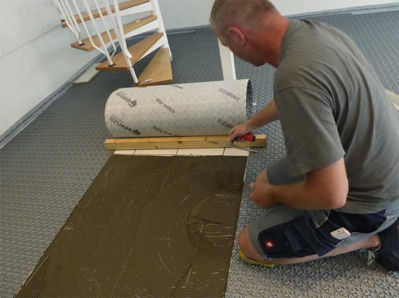 „Das war genau das, was ich gesucht habe“, erinnert sich der Bauherr. „Ausschlaggebend waren für mich zudem der geringe Verbrauch von 100 Watt pro Quadratmeter und die schnelle Erwärmung des Raumfußbodens, denn ich möchte ja nicht die Betondecke heizen.“ Das gewährleistet IndorTec TERM-E perfekt, weil die Wärme hauptsächlich nach oben abgegeben wird. Damit die Bodenbeläge schnell die gewünschte Temperatur erreichen, sind bei IndorTec THERM-E die Heizkabel vollflächig mit Kleber ummantelt. Dadurch wird nicht zuerst die Unterkonstruktion erwärmt, sondern der Belag. Und die spezielle Geometrie der Trägermatte sorgt dafür, dass rund ein Drittel weniger Hohlräume aufgeheizt werden als bei vergleichbaren Systemen.