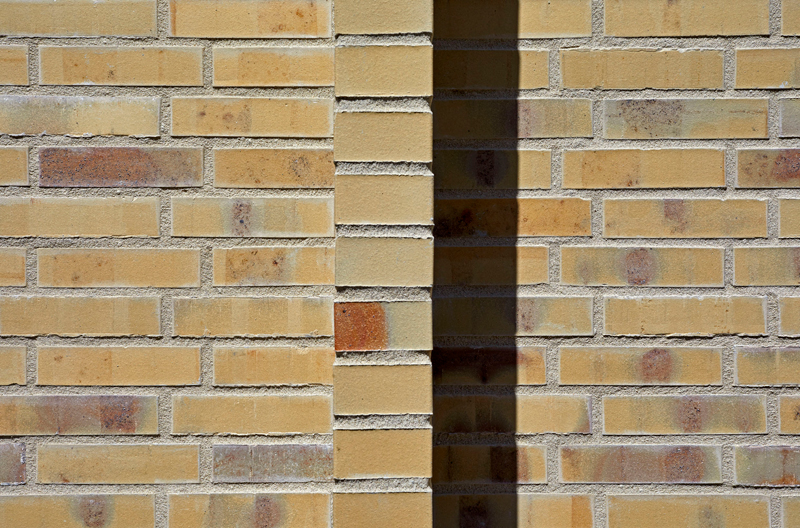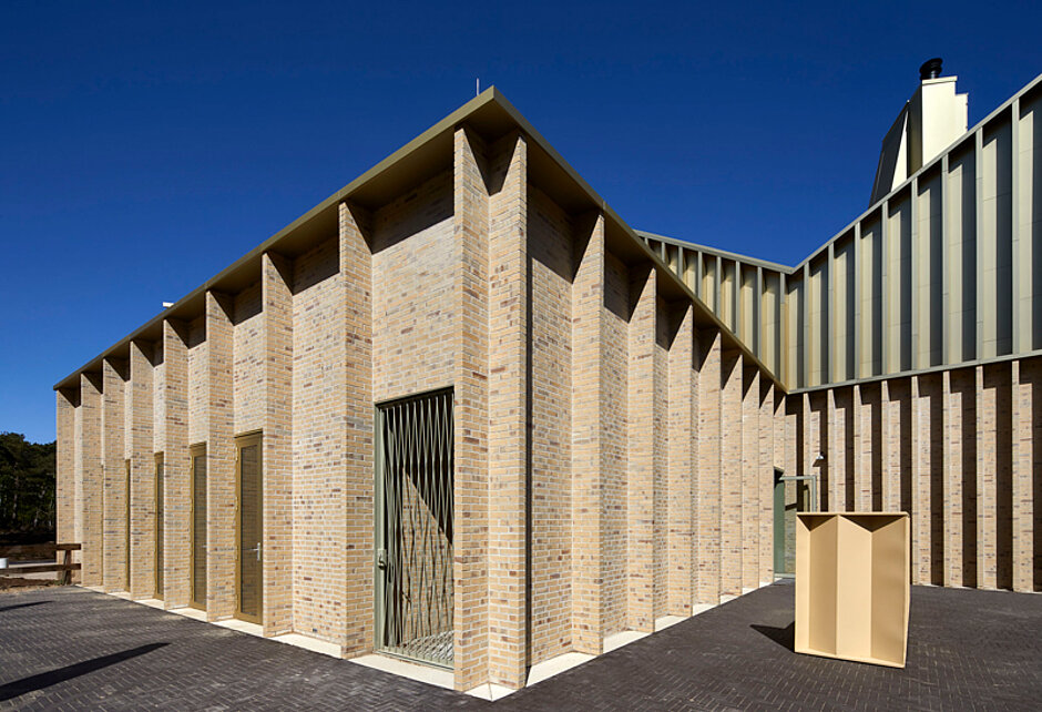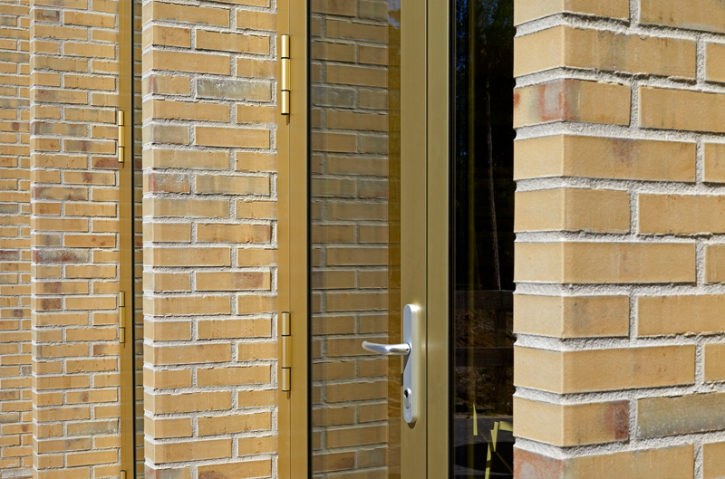 Die Fassadengestaltung greift in ihrer Farbigkeit ihre Umgebung auf: den Sand und die Heide. Monadnock und De Zwarte Hond entschieden sich hier für eine Kombination aus champagnerfarbenem Aluminium und Klinker. Gesucht wurde ein Stein, der optisch mit den Leichtmetallprofilen harmoniert. Fündig wurden die Architekten mit der sandfarbenen Hagemeister-Sortierung »Kopenhagen« in der Sonderausführung GT+FU. Die glatte Sichtseite des Klinkers wurde hier mit der raueren, ursprünglicheren Fußseite zusammen im Wechsel vermauert. Diese Objektsortierung von Kopenhagen ist ein harter, langlebiger und nachhaltiger Klinker, der laut Hersteller nicht verschmutzt, und gleichzeitig ein nuancierter Stein mit einer sandgelben Tönung, rotbraunen und rosa Akzenten und weniger Sinterung. Diese Merkmale fügen sich nahtlos in die Aluminiumverkleidung des Pavillons und seine Verwendung an diesem Standort ein. Außerdem wollten die Architekten mit dem Stein Mauerfelder schaffen, die nicht zu abstrakt anmuten. Ermöglicht wurde dies durch den Einsatz der Rückseite der Hagemeister-Klinker. Diese Fußseite ist an den Rändern etwas gröber, was die strenge Geometrie der Mauerfelder belebt.