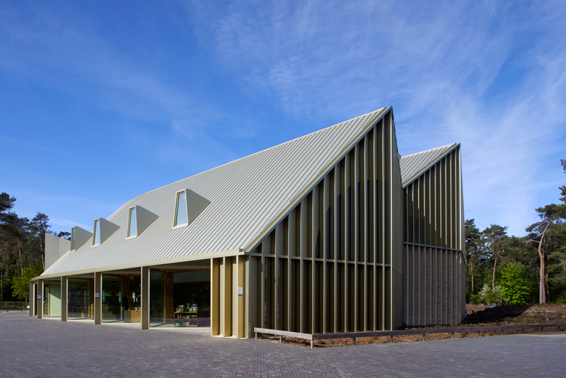 Der Nationalpark »De Hoge Veluwe« in der niederländischen Provinz Gelderland ist ein 5 400 Hektar großes Naturschutzgebiet. Eine der Bauten im Herzen des Parks ist das neue Besucherzentrum »Parkpaviljoen«, das auf 3 300 m2 eine Rezeption, ein Restaurant und einen Shop beherbergt. »Wir haben den Parkpavillon als ein zeitgenössisches Landhaus enworfen, mit einer Reihe von typischen Merkmalen dieser Typologie, wie dem Satteldach und dem Kamin, aber immer mit einem Augenzwinkern«, beschreibt Job Floris von Monadnock.