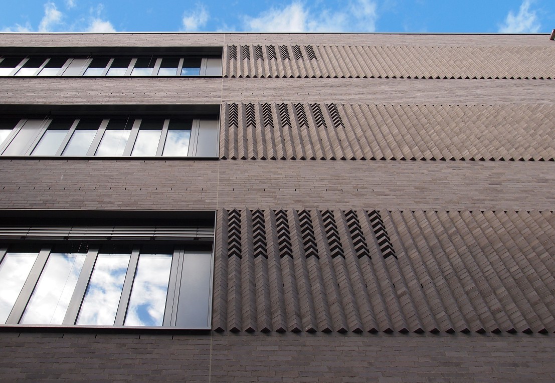 Die Materialität des denkmalgeschützten Teils verleitete die Architekten zu der Entscheidung, auch für den Neubau Klinker zu wählen. Verarbeitet wurde ein grauer Hagemeister-Stein der Sortierung „Island BA+FU“, der sich durch sanfte Nuancen in verschiedenen Grautönen und Akzente durch charaktervollen Kohlebrand auszeichnet. Die Oberfläche der Klinker-Sortierung weist unregelmäßige und teils wellige Kanten auf und erinnert an die verwendeten Ziegel des Bestandsgebäudes. Die wechselseitige Verarbeitung der Klinker, bei der auch die Fußseiten – die Spuren aus dem Produktionsprozess erkennen lassen – sichtseitig zum Einsatz kamen, rhythmisiert das Fassadenbild zusätzlich. Verarbeitet wurde der Ziegel im Dünnformat, in verschiedenen Mauerwerksverbänden, was die Funktionen hinter der Fassade von außen sichtbar für die Passanten an der Gebäudehülle ablesbar macht. Die glatten Fassadenbereiche sind im wilden Verband gemauert. Bei den Fenstern kam eine Art Band mit speziellen Formklinkern im Stromlinienverband zum Einsatz. Diese besondere Ausführung steht eigenständig zur vorhandenen Lochfassade des bestehenden Teils. Auch die polygonalen Gebäudeecken wurden im jeweiligen Verband mit Formklinker ausgearbeitet.