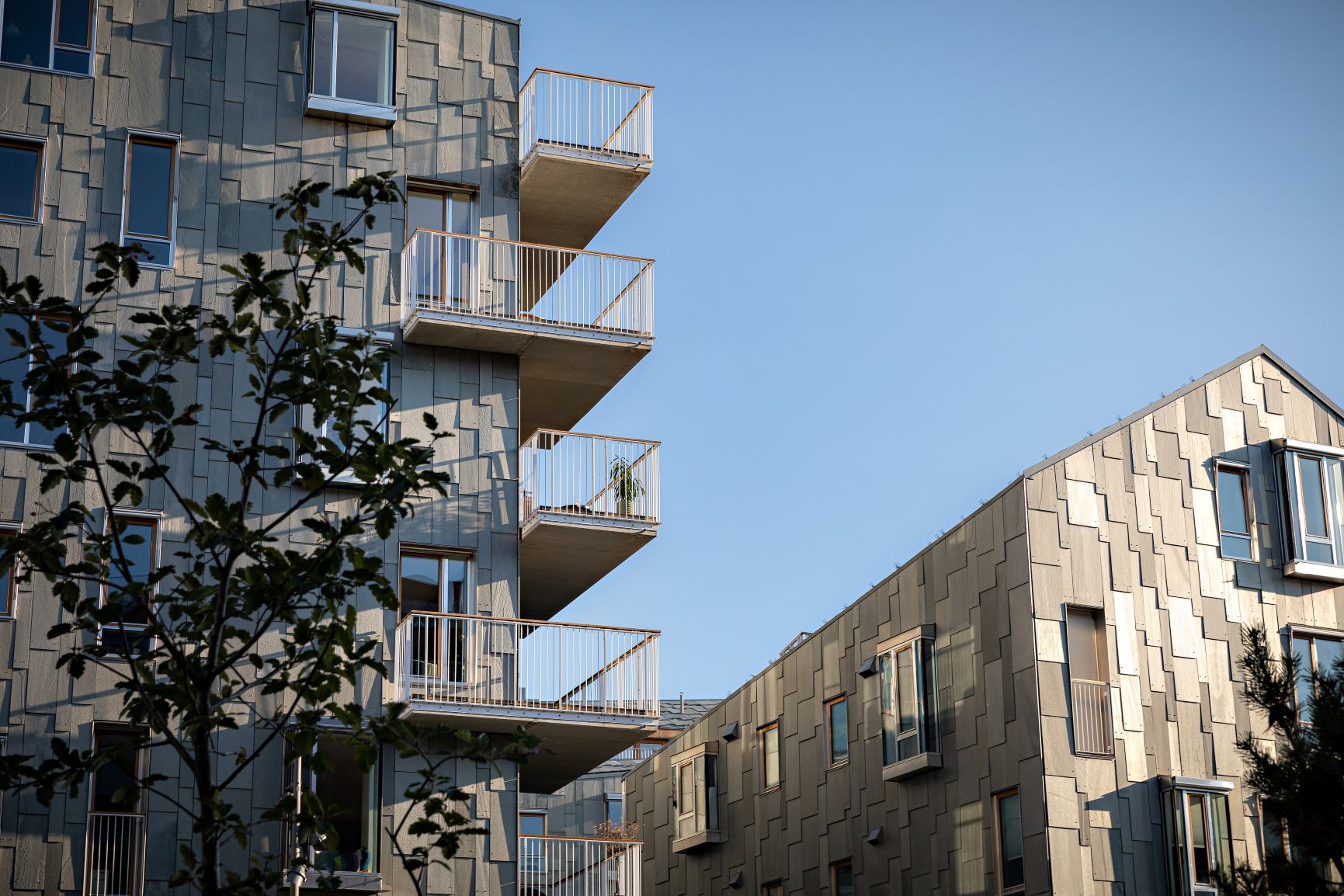 Die Siedlung besteht aus verschieden hohen Solitären, die sich in asymmetrischer Anordnung über das Gelände verteilen. Vor allem die Fassaden und Dächer verleihen der Wohnanlage einen einzigartigen Look. Sie sind aus hellem Schiefer gefertigt, der für eine faszinierende Lebendigkeit sorgt. Die Dachschrägen mit dem zu jeder Tageszeit anders schimmernden Schiefer bilden eine ästhetische Einheit mit der Wasserfläche des ehemaligen Hafenbeckens. In jedem der Gebäude verbindet ein zentrales Treppenhaus die Etagen miteinander, wobei die Parterre Boutiquen, Restaurant und Cafés beherbergen, sodass die Bispevika-Bewohner in ihrem Viertel eine sympathische Innenstadt-Atmosphäre genießen können, ohne das Quartier zu verlassen.