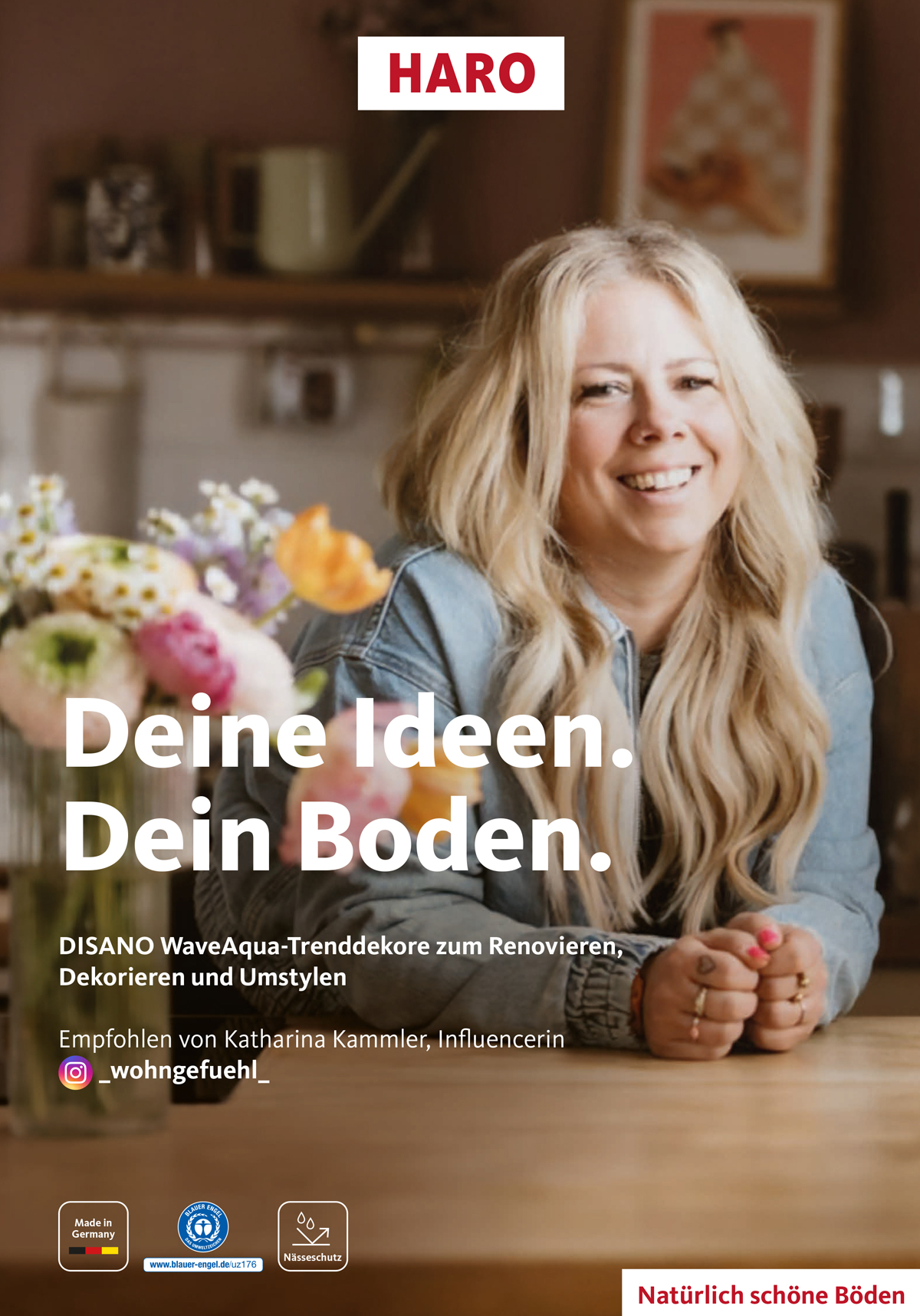 Haro setzt den Fokus bei seinem Designboden »WaveAqua« ab sofort auf die Themen Lifestyle und Wohntrends und möchte das Produkt auch im Fachhandel emotional positionieren. »Wir haben mit Frau Kammler eine Trendsetterin an unserer Seite, die seit 14 Jahren ihr Haus renoviert und dekoriert und ihre Follower auf Instagram immer wieder inspiriert«, erklärt Gerold Schmidt, Geschäftsführer von Hamberger. »Unsere Haro ›Disano WaveAqua‹ Designböden eignen sich dazu ideal.«