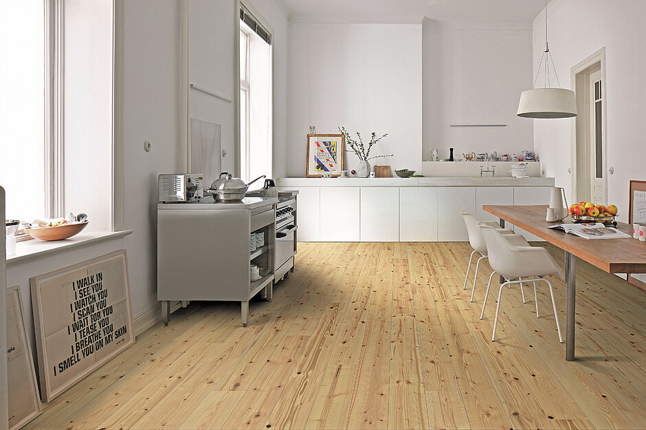 Die Holzart Tanne schafft in der Serie »4 000« bei der »Landhausdiele 180« neue Gestaltungsvarianten. An Farben stehen Tanne Lichtweiß universal, Tanne universal und Tanne pastellgrau, jeweils mit der »NaturaDur«-Oberfläche zur Verfügung.