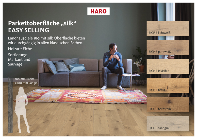 Hierzu Klaus Trautner, Leiter Produktmanagement bei HARO: „Mit der ´silk` Oberflächenstruktur ist es uns gelungen, die Pflegeleichtigkeit mit einer sei-denweichen Haptik zu kombinieren. Die Oberfläche schmeichelt Händen und Füßen bei jeder Berührung und lässt die Fußbodenfläche dadurch ungeheuer sanft, warm und besonders wohnlich erscheinen. Gleichzeitig ist ´silk` die per-fekte Lösung bei unserer Landhausdiele 180 für den Trend nach besonders natürlich matt erscheinenden Oberflächen.“