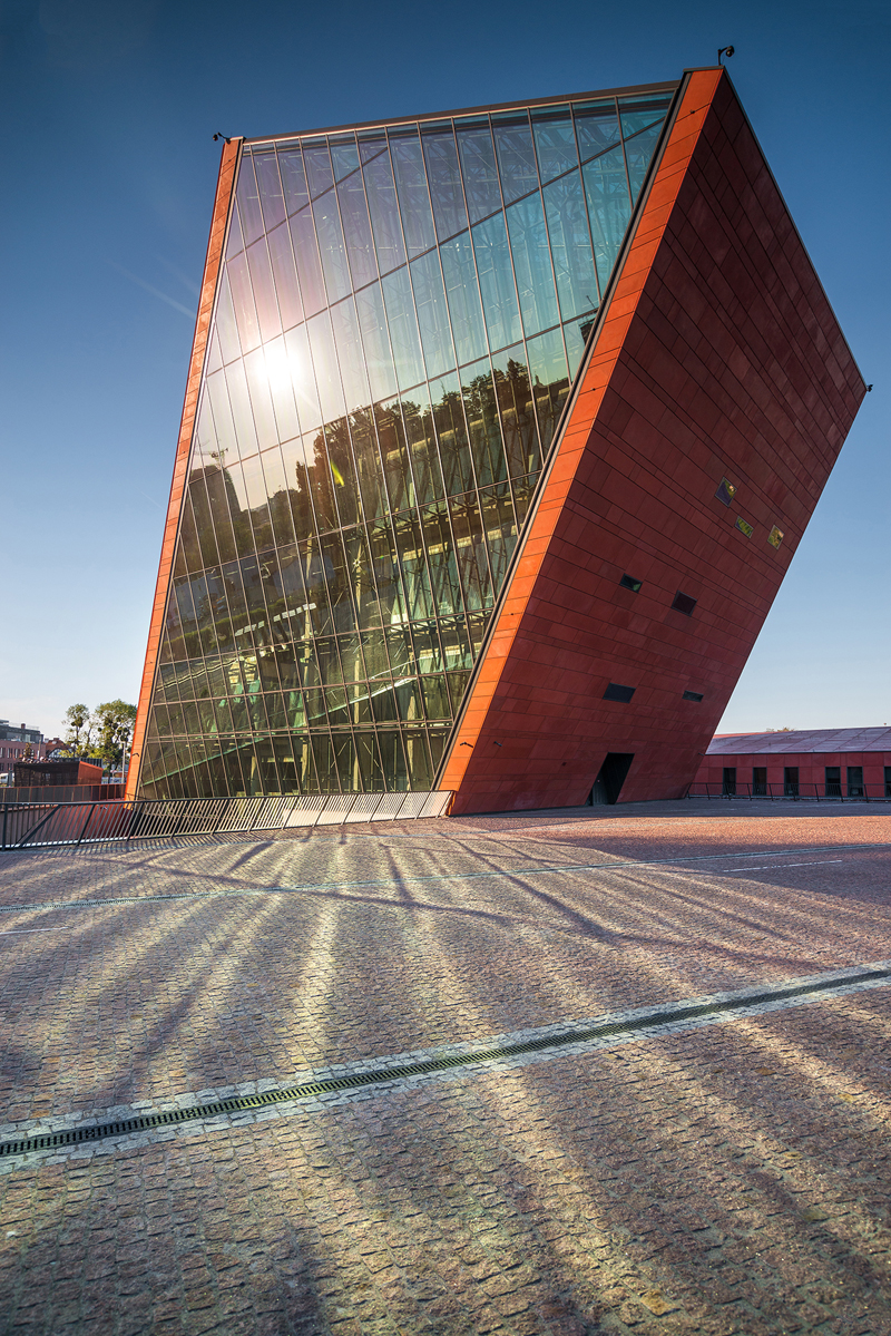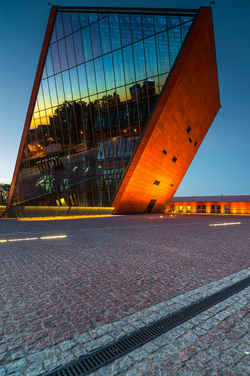 In der polnischen Hafenstadt Danzig wird die Geschichte des größten bewaffneten Konflikts des 20. Jahrhunderts auf einer Fläche von 5.000 Quadratmetern erzählt. Damit stelltdas Museum weltweit eine der umfassendsten Ausstellungenüber den Zweiten Weltkrieg. Das Gebäude selbst, entworfen von Daniel Libeskind, dem renommierten US-Architekten polnisch-jüdischer Herkunft, beeindruckt durch seine abstrakte Form, die wie ein schräg gelegter Turm mit verglaster Fassade markant in ihr Umfeld ragt. Hauraton war beim Entstehen des Gebäudes für das ebenso außergewöhnliche Entwässerungssystem verantwortlich. Darin unterstreichen die parallel um den Turm angeordneten schwarzen Entwässerungslinien seinen expressiven Charakter.