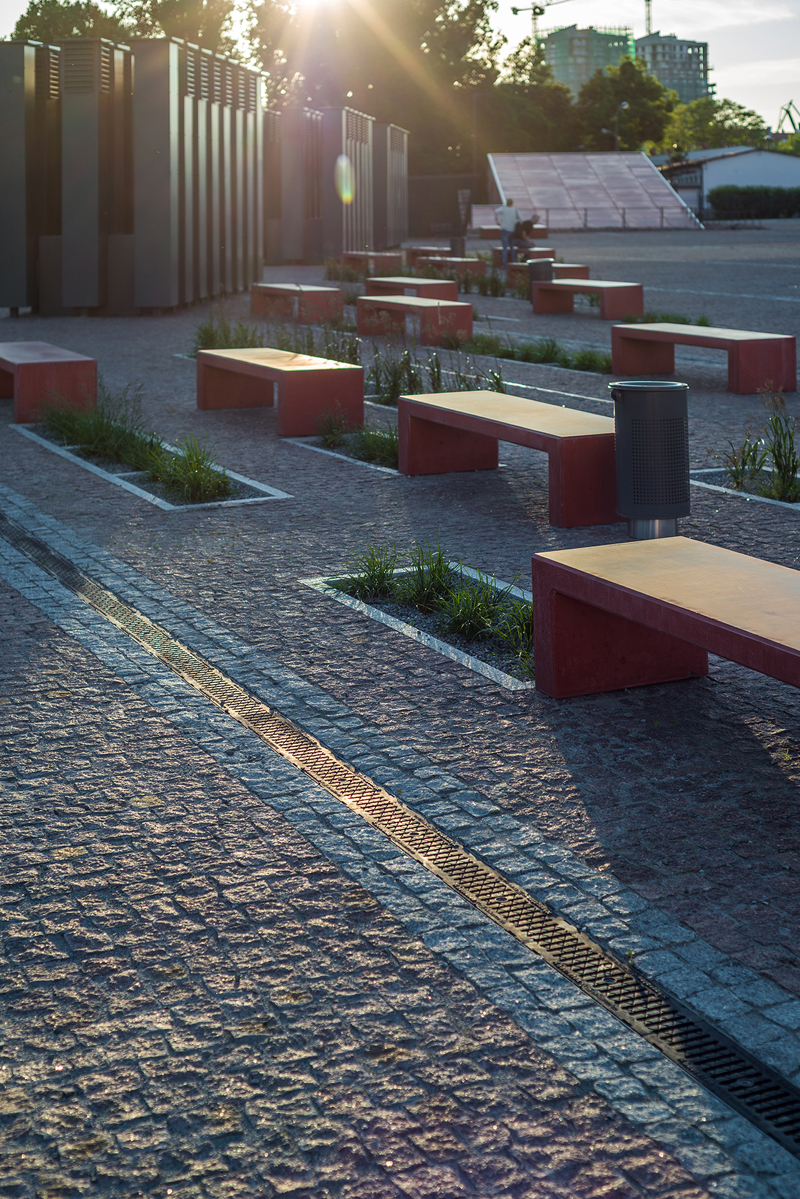 Der den Turm umgebende Platzbildet gleichzeitig das Dach des unterirdischen Museumsteils. Entwässerungslinien durchziehen seine gesamte Fläche, verlaufen unter den Füßen der Besucherebenso wie über ihren Köpfen. Besondere Herausforderung: Da das Entwässerungssystem auf der Bodenplatte eingebaut wurde und der Abfluss nach unten durch die Bodenplatte geführt wird, war es nicht möglich, Einlaufkästen zu installieren. Die Empfehlung von Hauraton bestand in der Verwendung des Faserfix KS Systems, das auf faserverstärktem Beton basiert. „Bei diesem Rinnensystem lässt sichan jeder beliebigen Stelle des Rinnenbodens ein Loch bohrenunddie Rinne auf diejeweils exakt benötigte Länge zuschneiden”, erläutert Rafał Rychert, verantwortlicher Projektberater von Hauraton inPolen. Damit lässt sich das Entwässerungssystem optimal an die spezifischen Projektanforderungen anpassen. Zur Fertigstellung der Entwässerungsleitung wurden KTL-beschichtete Gussroste verwendet. Die bauliche Durchführung des Entwässerungskonzepts lag vor Ort beim Kwadrat Architektur Studio.