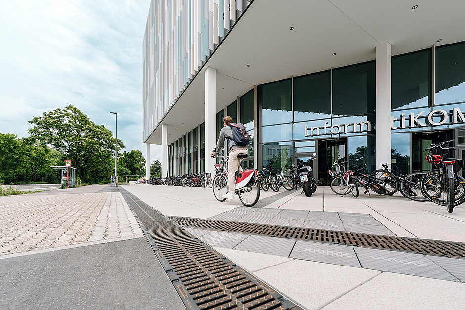 Zusätzlich unterstützen die Rinnen auf der Freifläche vor dem InformatiKOM nicht nur die architektonische Gestaltung des Ensembles, sondern fungieren in ihrem farblichen und haptischen Kontrast auch als Wegeleitsystem, das sowohl Passanten als auch sehbeeinträchtigten Menschen Orientierung bietet.