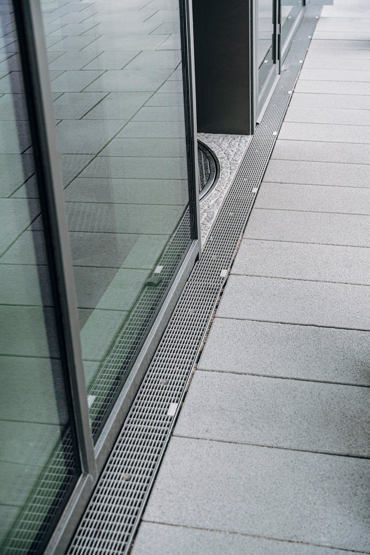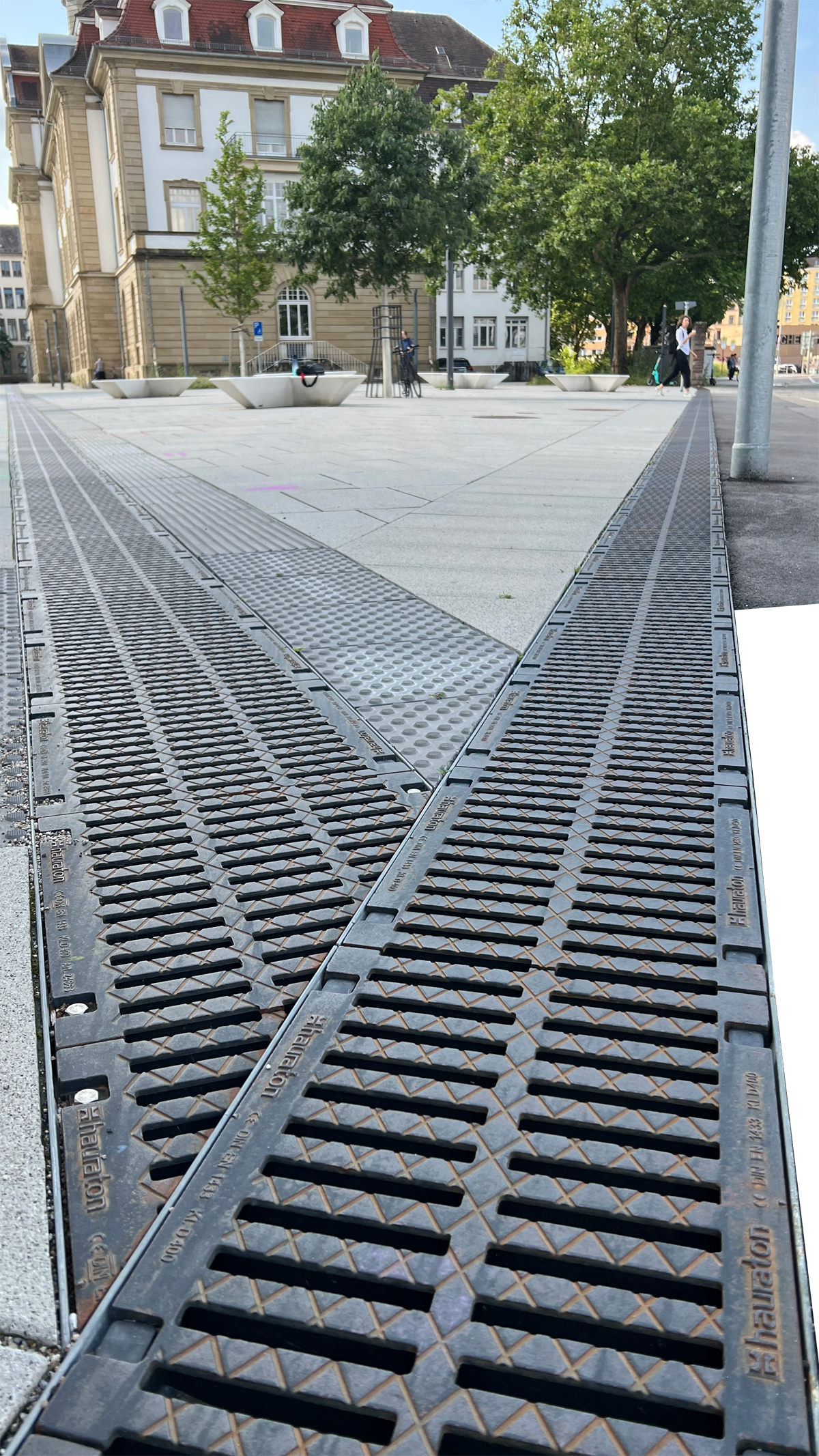 In Zusammenarbeit mit den Projektpartnern bau+grün und Bauer Landschaftsarchitekten wurden in der Gesamtlösung diverse Rinnenstränge eingeplant, die das gesammelte Wasser um Gebäude und Platz herum zu den umliegenden Grünflächen führen. Thorin Oesterle: »Sie fungieren als Rückhaltebecken und Versickerungsmulden.«