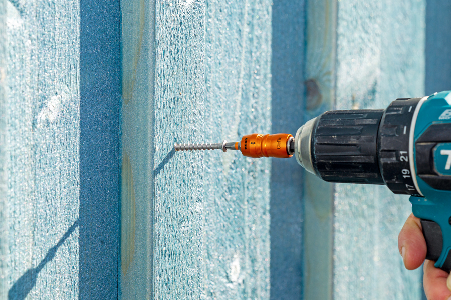 »Wir benötigten eine Schraube, die das Anbauteil zuverlässig befestigt und die – aufgrund der sichtbaren Verschraubung – gut aussieht«, so Zimmerermeister Roberto Teuscher. Die Fassadenschraube »Heco-Topix-plus« konnte hier ihre Vorteile ausspielen: Ihr schlanker Linsensenkkopf ermöglicht eine oberflächenbündige Verschraubung. Einzigartig ist laut Heco der Zusammenzieheffekt »MagicClose« der Schraube. Durch ihre unterschiedliche Gewindesteigung zieht sie die Bauteile zusammen, ohne dass der Kopf tief im Holz versenkt werden muss. Die Besonderheit der neuen »Heco-Topix-plus« Fassadenschraube: Ihre verkürzte Geometrie erlaube eine geringere Einschraublänge in die Unterkonstruktion, ohne dabei Abstriche bei der sicheren Befestigung zu machen. Für Verarbeiter ergebe sich durch die Reduktion der Schraubenlänge eine Kostenersparnis – ebenso wie eine Zeitersparnis bei der Verarbeitung. Diese Erfahrung machte Marina Winkler, die Teil des Montageteams war und zahlreiche Deckleisten befestigte, sie ergänzt: »Außerdem hält die Edelstahlschraube sicher am Bit, was einhändiges Arbeiten ermöglicht.« Ein Merkmal, das an der exakten Passform von Bit und Schraube liegt und sich »GripFit« nennt. J