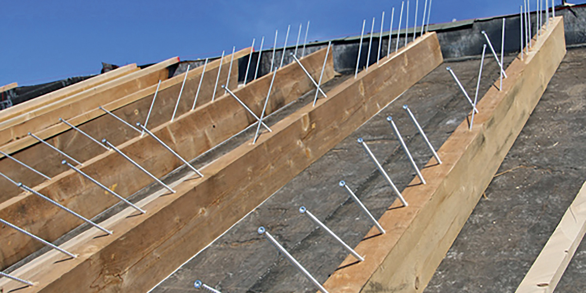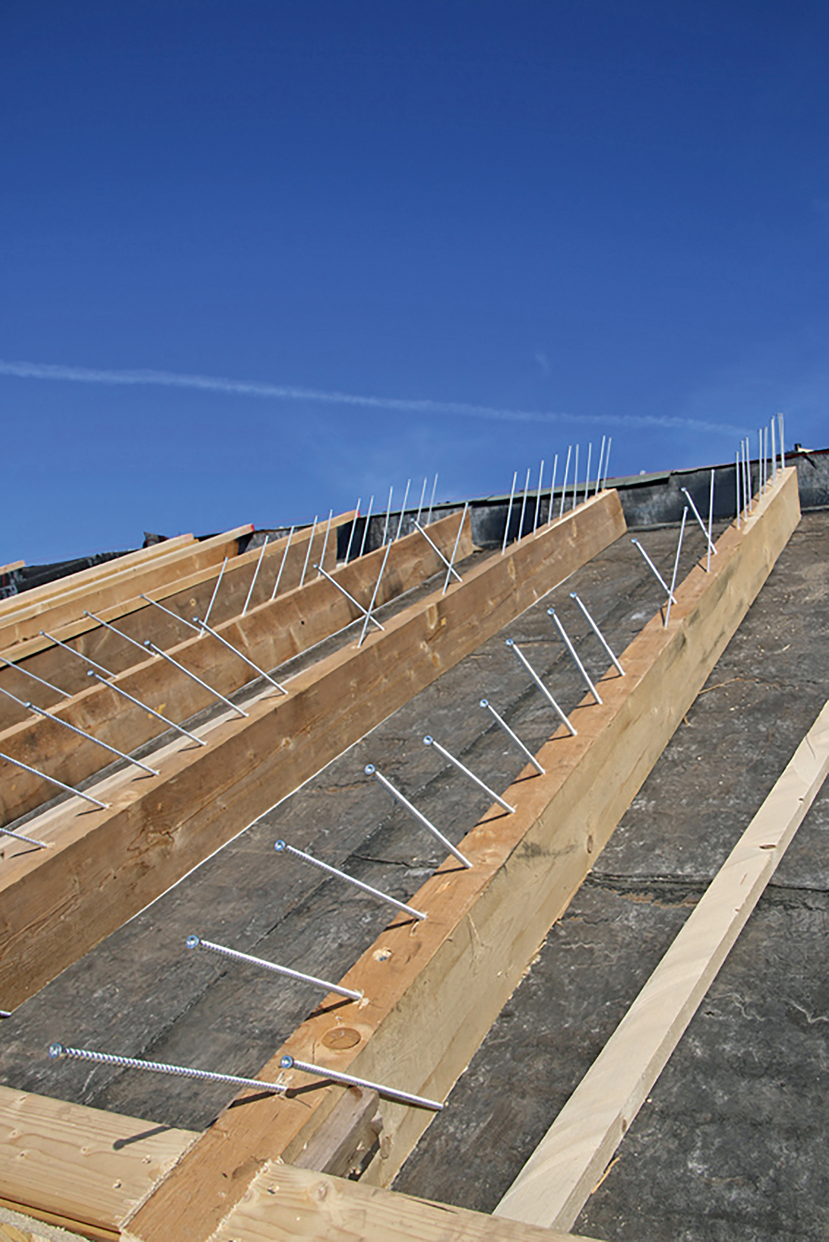 Vor allem im ersten Schritt des Projekts – während der Abbrucharbeiten – sah sich das durchführende Bauunternehmen Hansjörg Kunze aus Heldrungen mit verschiedenen Herausforderungen konfrontiert. Zum einen betrafen diese Schadstoffbelastungen im Abbruchmaterial und die Belüftungsebenen beim Wiederaufbau, zum anderen aber auch die Beschaffenheit der bestehenden Tragkonstruktion. Hier mussten die Annahmen zur statischen Tragfähigkeit und zur Funktionsweise der Tragwerke ständig überprüft und für den Neuaufbau berücksichtigt werden. »Angesichts der Dachgröße und der Anforderungen an die Tragfähigkeit wurde für die neue Konstruktion eine große Menge an Schrauben benötigt. Deshalb spielte bei der Produktauswahl neben den statischen Vorgaben vor allem auch die schnelle und breite Verbindungsmittelverfügbarkeit eine wesentliche Rolle. Die Produkte und insbesondere die Qualität von Heco-Schrauben haben uns hier überzeugt«, berichtet Jonny Kunze, Bauleiter des Daches. So kamen bei dem Projekt zur Befestigung und zur statischen Verstärkung rund 3 000 Vollgewindeschrauben des Typs »Heco-Topix-plus« mit den Spezifikationen 8x380 zum Einsatz.