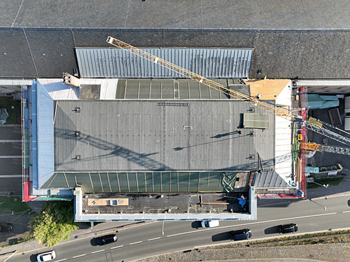 Die Sanierungsmaßnahmen konzentrierten sich auf zwei Bereiche des Gebäudedachs: das Hauptdach, das eine tonnenförmige Flachdachkonstruktion aufweist, sowie das angrenzende Mansarddach.