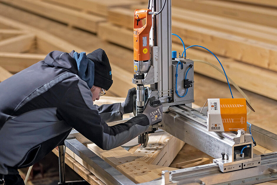 Konkret werden die Stabdübel als Verbindungsmittel in den Knoten benötigt. Zunächst wurden die Brettschichthölzer des Binders mit der firmeneigenen Abbundanlage K2i eingeschlitzt, dann wurde ein dünnes Stahlknotenblech eingesetzt. Durch die sehr gedrungene Geometrie und die daraus resultierenden hohen Anschlusskräfte im Fachwerkträger lagen die Bleche in den meisten Knoten doppelt. Um die Stahlknotenbleche im Knoten kraftschlüssig zu verbinden, wurden die Heco-Stabdübel »WS-T« verwendet. Da diese selbstschneidend sind, mussten die Stahlknotenbleche nicht vorgebohrt werden. Die Zimmerleute von Scharf Systembauelemente nutzten für die Setz- und Einbringarbeiten der Stabdübel von Heco gemietete Setzgeräte. »Mit korrekt eingestelltem Vorschub funktionierte das Setzen perfekt. Das hat uns die Arbeit deutlich erleichtert. Ein weiterer großer Vorteil war das Teilgewinde oben am Stabdübel, was dafür sorgt, dass dieser sich praktisch wie eine Schraube millimetergenau platzieren lässt und der Stabdübel gleichzeitig lagesicher fixiert ist«, berichtet Diplom Bauingenieur Robin Scharf, der maßgeblich an der Planung und Umsetzung der Dachkonstruktion beteiligt war.