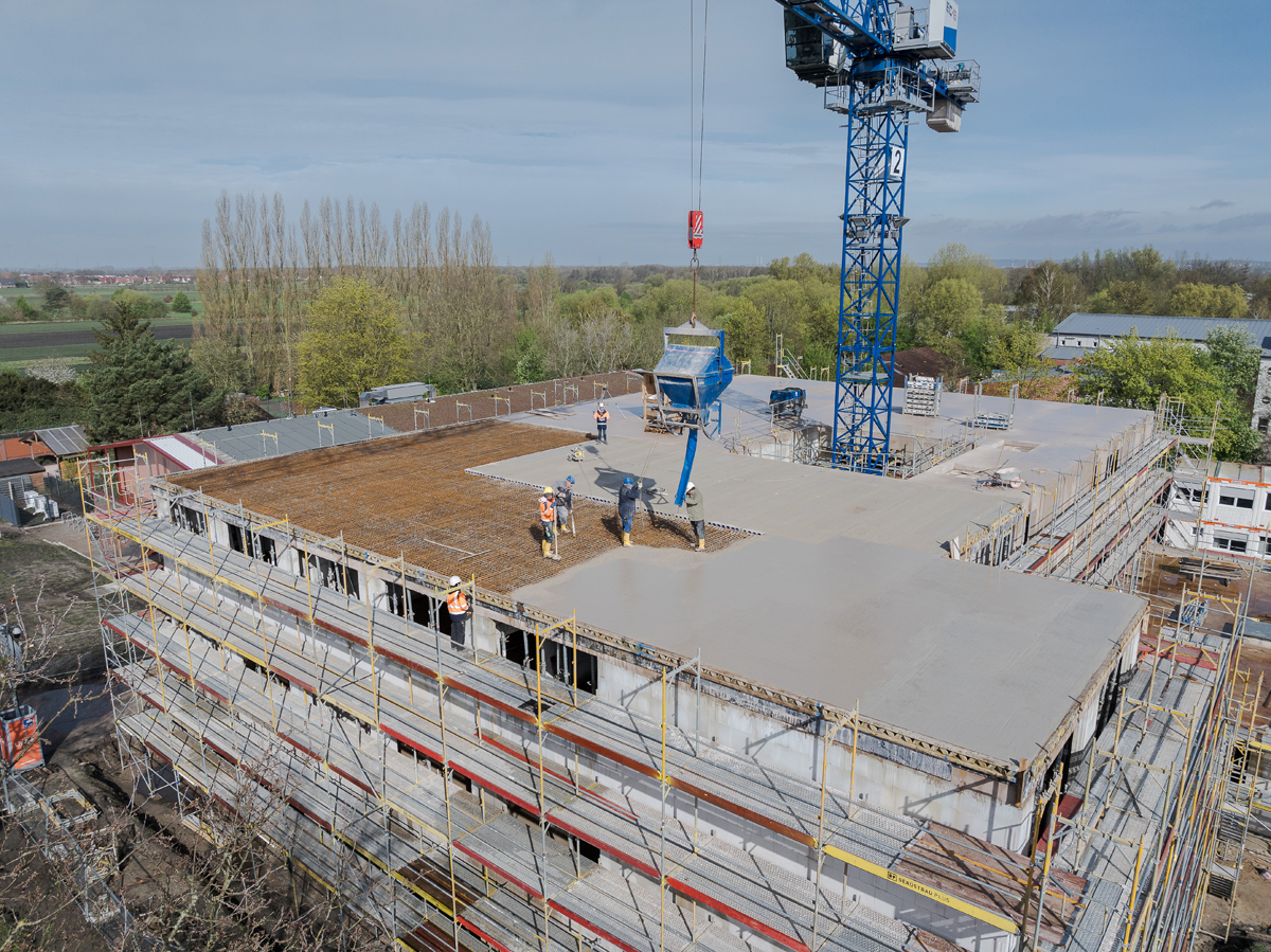 Die Grundschule Ohrnsweg wird derzeit von rund 360 Schülerinnen und Schülern besucht. »Die Anlieferungszeiten lagen stets außerhalb des Schulverkehrs. Wo immer möglich, haben wir große Betonagen in die Schulferien verlegt und Sicherheitsposten an den Schnittstellen positioniert. Betonmischer trafen teilweise alle 10 bis 15 Minuten ein, was eine präzise Zeitplanung erforderte. Die App ›OnSite‹ von Heidelberg Materials war dabei äußerst hilfreich. Mit dem Livetracker konnten wir die Ankunftszeiten der Fahrmischer genau planen und für die notwendige Sicherheit sorgen«, so Herzog. So konnte die Sicherheit der Schüler gewährleistet und der Bauablauf reibungslos gestaltet werden.