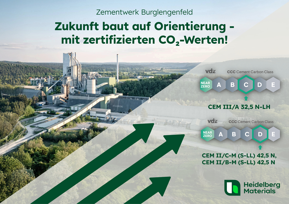 Die zertifizierten »evoBuild«-Zemente – »CEM II/C-M (S-LL) 42,5 N«, »CEM II/B-M (S-LL) 42,5 N« und »CEM III/A 32,5 N-LH« – stammen aus dem Werk Burglengenfeld und erfüllen die Kriterien der CCC-Klasse C bzw. D. Sie unterschreiten den Schwellenwert von 500 kg CO₂-Äquivalent pro Tonne Zement, der laut VDZ als Maßstab für nachhaltige Zemente gilt. Damit sind sie nicht nur Teil des »evoBuild«-Portfolios, sondern auch Vorreiter in der Anwendung des neuen CO₂-Labels.