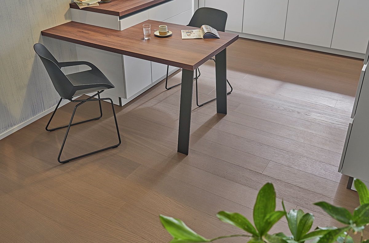 Bei »HKS lounge« handelt es sich um einen Echtholzboden, der aus natürlichen und unbedenklichen Materialien hergestellt wird. Laut Hersteller kombiniert er die Nachhaltigkeit und Natürlichkeit eines edlen Parketts mit den positiven Eigenschaften eines Vinylbodens hinsichtlich Strapazierfähigkeit und Pflegeleichtigkeit. Dank der patentierten »5G«-Klickverbindung gestaltet sich die Verlegung auch für den Heimwerker einfach und schnell.