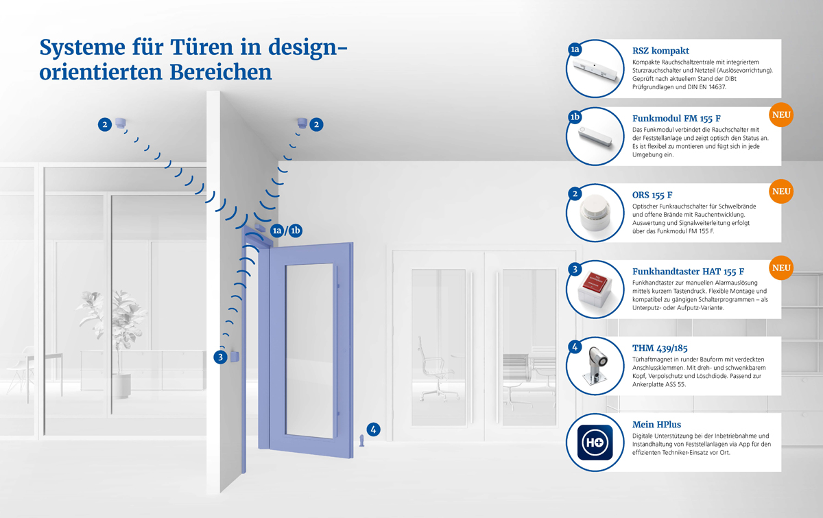 Das System eignet sich sowohl für neue als auch für bestehende Anlagen zur Nachrüstung. Für anspruchsvolle Anwendungen an Brandschutztüren empfiehlt sich die Kombination mit der Rauchschaltzentrale und dem Türschließer, was nicht nur die Funktion im Brandfall optimiert, sondern auch ästhetisch ansprechende Lösungen ermöglicht. Auch bei Brandschutztoren bietet das Funksystem »155 F« zahlreiche Vorteile – insbesondere in industriellen Anwendungen, wo es mit der Feststellanlagenzentrale »Basis/Pro 230 V« integriert werden kann.