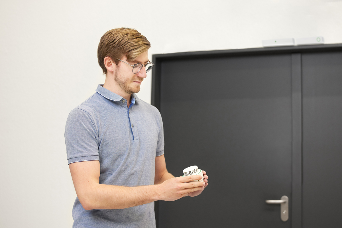 Der »Funkrauchschalter ORS 155 F« bietet zuverlässige Brand- und Raucherkennung an Brand- und Rauchschutzabschlüssen. Dank seiner Streulichttechnologie erfasst er Schwelbrände und offene Brände frühzeitig. Im Ernstfall alarmiert er das »Funkmodul FM 155 F«, welches umgehend reagiert, indem es den Brand- oder Rauchschutzabschluss schließen lässt. Das Funkmodul selbst bildet die Schnittstelle zum verdrahteten System und kann bis zu 20 Funkteilnehmer vernetzen. Wird ein Brand von einer anwesenden Person bemerkt, dient der »Funkhandtaster HAT 155 F« als manueller Auslöseschalter. Dann genügt ein Tastendruck, um einen Alarm an das Funkmodul zu senden. Die Rauchschalter und das Funkmodul sind in unterschiedlichen Farbvarianten erhältlich.