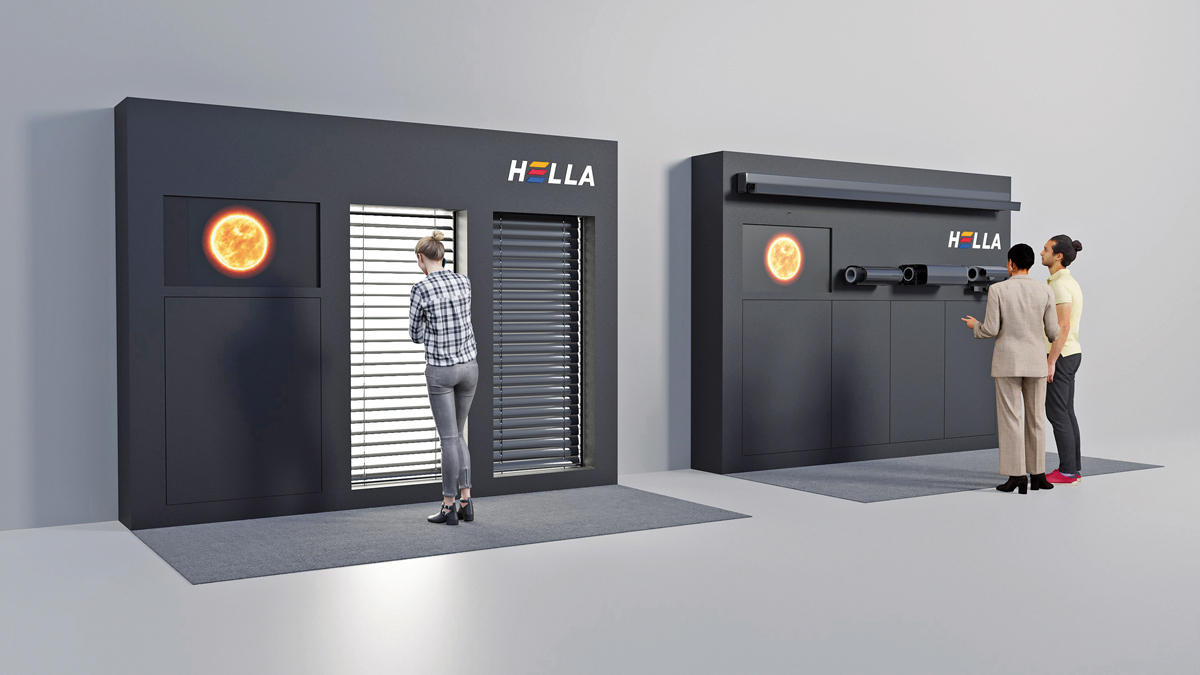 Die Erlebniswelt »Cube« bietet für Endverbraucher und Architekten ein Erlebnis für alle Sinne. Das Hella Shop-in-Shop-Konzept benötigt 40 m2 Verkaufsfläche und gliedert sich in drei Zonen. Zunächst beginnt unter einer Pergola das Beratungsgespräch. Über die im Tisch integrierte digitale Oberfläche kommen Händler den individuellen Wohnkomfort-Ansprüchen der Käufer auf die Spur. Die Angaben, die dort gemacht werden, generieren im Hintergrund das Bildmaterial und die Animationen für das Erlebnis in der zweiten Zone, dem Herzstück des Ausstellungskonzepts – dem Hella »Cube«. In diesem multimedialen Erlebnisraum können Kunden den Produktnutzen mit allen Sinnen erfahren. Auf einer großen Leinwand werden individualisierte Szenen des Wohnalltags mit Licht- und Soundsystem sowie Sonnenschutzanlagen verknüpft, sodass ein echtes Raumgefühl entsteht. Danach schreitet man für einen Perspektivenwechsel von innen nach außen. Der Kunde hat so die Möglichkeit, die unterschiedliche Wirkung der einzelnen Behänge am Fassadenbild zu sehen. Abgerundet wird das Kundenerlebnis in der dritten Zone, wo bei einem umfassenden Beratungsgespräch eine maßgeschneiderte Sonnenschutzlösung erarbeitet wird.