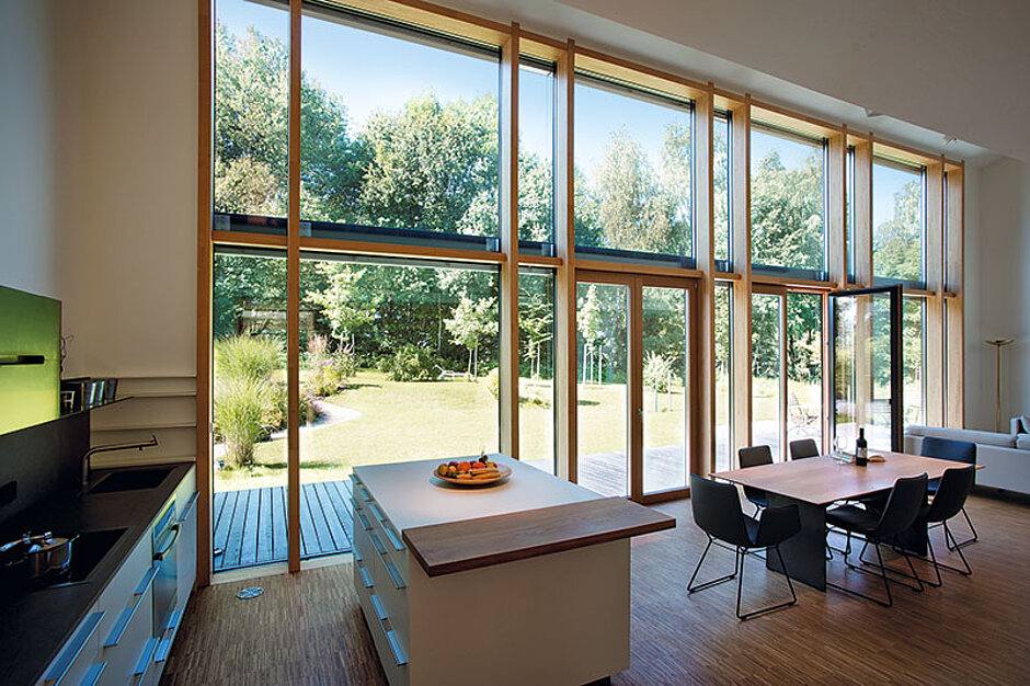 Die Glasfassade erstreckt sich über die gesamte Breite des Hauses über zwei Geschosse bis unter die Dachfläche. Sie ist als Pfosten-Riegel-Verglasung von Kneer-Südfenster mit 80 mm Aluminium-Holz-Profilen individuell gefertigt und bietet barrierefreie Übergänge. Gleichzeitig trägt die Pfosten-Riegel-Fassade auch die Dachflächen, so dass auf zusätzliche Stützen verzichtet werden konnte.