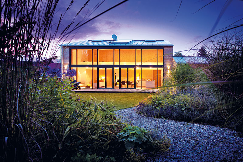 »Für mich ist Holz das Material der Zukunft, es hat Potenzial. Es hat eine sehr gute Umweltbilanz, es wächst nach und ist in großen Mengen verfügbar«, erläutert David Wolfertstetter, der neben seiner Tätigkeit als freier Architekt als wissenschaftlicher Mitarbeiter an der Professur für »Entwerfen und Holzbau« an der Technischen Universität München beschäftigt ist. Durch die hohe Dämmwirkung der Holzkonstruktion in Kombination mit den Holzwolledämmplatten erzielt das Haus zusammen mit einer Dreifach-Verglasung aller Glasflächen KfW 40 Effizienzhaus-Standard.