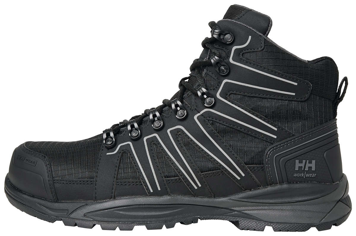 Mit Fokus auf robuste, hochwertige und langlebige Materialien sind Design und Passform von Helly Hansens »Manchester« Workwear Kollektion eher traditionell gehalten. Der »Manchester Mid« kommt mit metallfreiem Schutz vor dem Eindringen von Nägeln durch eine zusammengesetzte Sicherheits-Zehenkappe, eine nicht-metallische, durchstichfeste Platte und metallfreie Hardware. Dank einer leichtgewichtigen, dämpfenden EVA Zwischensohle, einer abriebfesten Polyester-Oberfläche und feuchtigkeitstransportierender, atmungsaktiver Air Mesh Fütterung bietet der Schuh Komfort und Sicherheit an jedem Arbeitsplatz, während reflektierende Details die Sichtbarkeit erhöhen sollen.