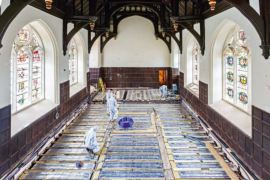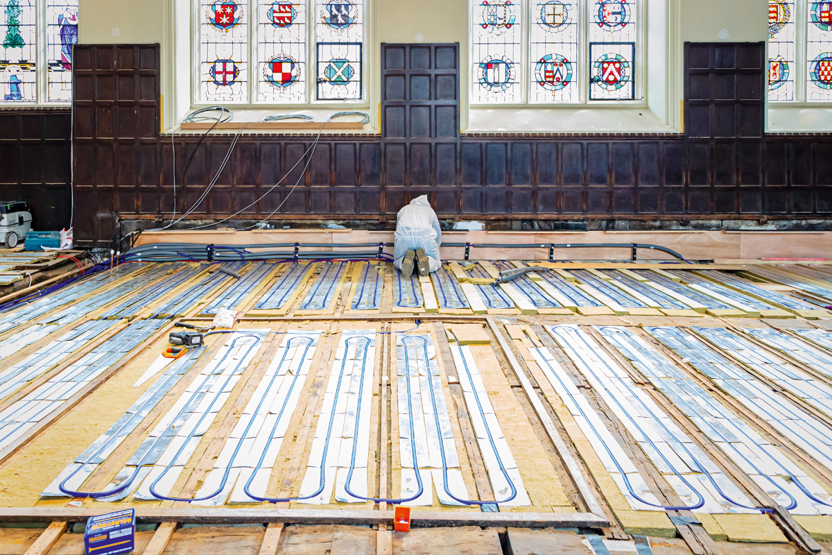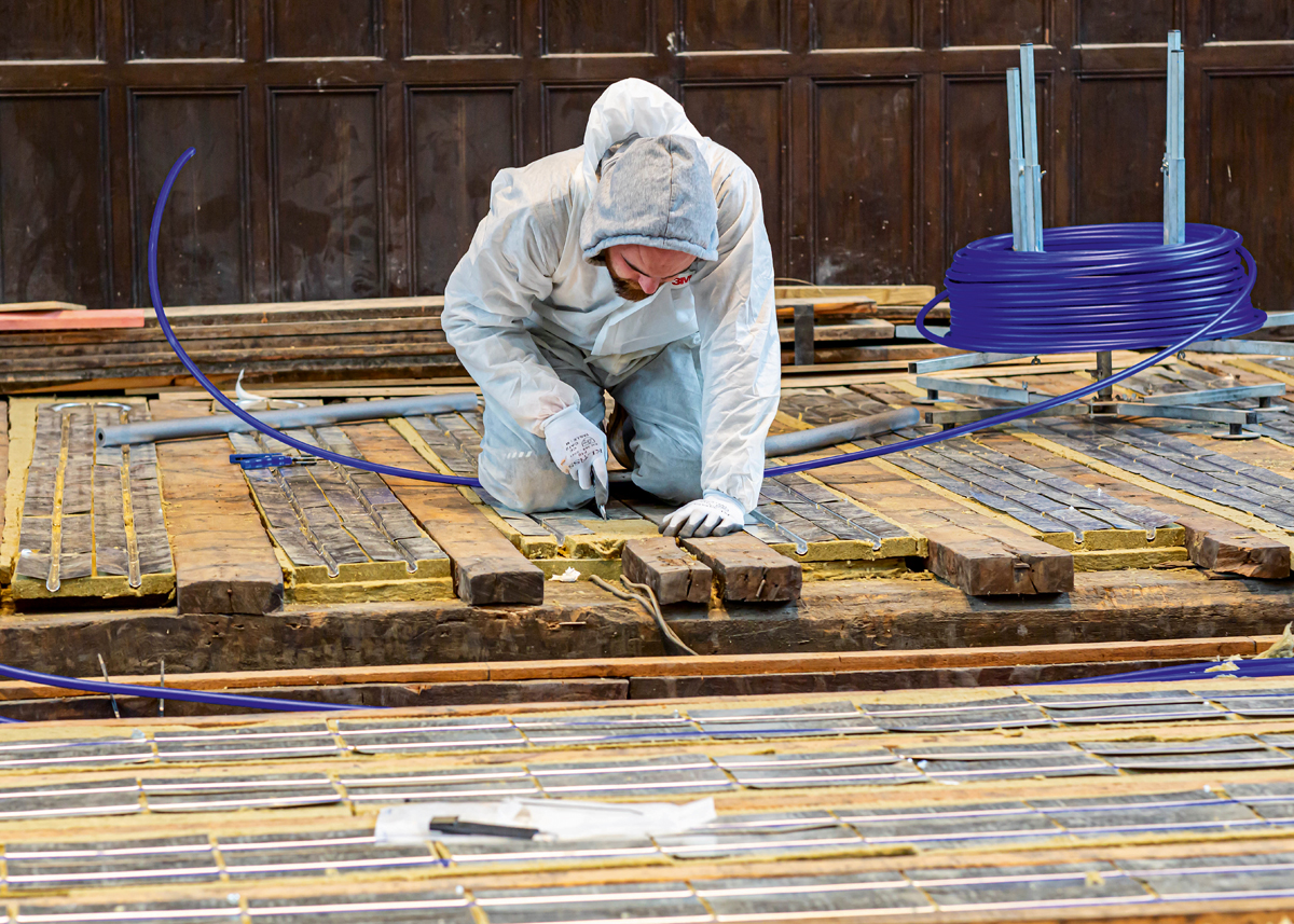Zum Einsatz kam in dem bereits im Mittelalter gegründeten Oriel College in Oxford die Herotec-Systemlösung »TempusDRY ROCK 30-16 AB« – mit dieser Fußbodenheizung konnten die hohen Ansprüche an den Brandschutz erfüllt werden. Das international mehrfach ausgezeichnete Architekturbüro »5th Studio« (ebenfalls aus Oxford) stellte bei der Sanierung zwei Bedingungen: ein auf Mineralwolle basierendes Flächenheizungssystem, um brennbare Materialien nach Möglichkeit aus dem Projekt auszuschließen, sowie das Belassen der Fußboden-Balken.