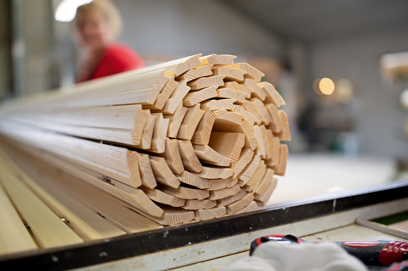Während jeder Rollladenpanzer – ob aus Aluminium-, PVC-, Edelstahl- oder Holzstäben –immer ein Einzelstück in Maß, Profil und Farbe ist, bedeutet die Herstellung eines Holzrollladen immer noch echte Handarbeit, wie Bernd Heydebreck erläutert. »Ein perfekter Holzrollladenpanzer muss stets vor seiner Konfektionierung zunächst so aufgelegt werden, dass die einzelnen Stäbe optisch zueinanderpassen und fehlerfrei sind. Das kann und muss ausschließlich per Hand erfolgen. Holz ist ein lebendiger Rohstoff und die Sortierung der Stäbe machen seit 180 Jahren meistens nur Frauen, die hier schlichtweg das bessere Auge und die notwendige Geschicklichkeit beim Ketteln haben.« Das Holz für seine Rollläden kauft Heydebreck ausschließlich bei staatlich überwachten Sägewerken in Skandinavien. Hier sei gewährleistet, dass keine Kiefern-Stämme aus einer Massenrodung kommen, zumal die nordische Kiefer aufgrund ihrer Basis-Qualität immer nur als einzelner Stamm nach dem Überschreiten ihres Lebenszenits gefällt wird. Zur Nachhaltigkeit des Produkts trägt auch seine lange Lebensdauer von rund 100 Jahren bei. Außerdem verzichtet Heydebreck bereits seit Mitte der 80er-Jahre auf das lösungsmittelhaltige »Xyladecor« zur Oberflächenbehandlung und verwendet stattdessen wasserlösliche und umweltfreundlliche Lasuren und Lacke.
