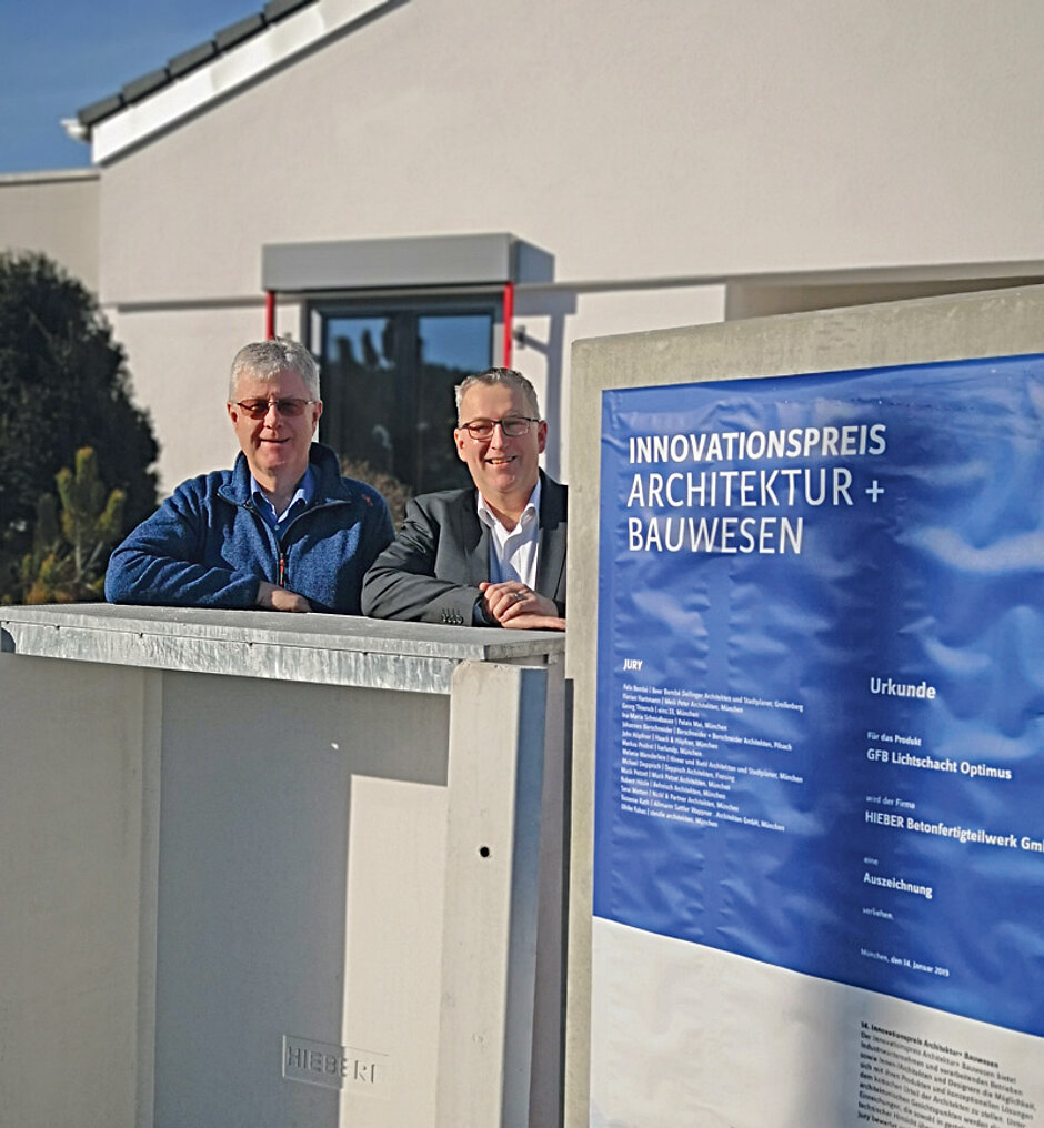»Der GFB-Lichtschacht ›Optimus‹ von Hieber, als Fertigteil in Beton, ist ein ungewöhnlich schlanker Lichtschacht. Durch eine Armierung aus Kohlefasergewebe erreicht er eine Wandstärke von 3 cm bei üblichen Lichtschachtverhältnissen und somit einen Status als Leichtgewicht. Er wird aus Weißzement hergestellt und erleichtert so den Lichteinfall. Die schlanke Stärke des Lichtschachts ermöglicht auch einfache Details für ein Anarbeiten der Außenanlagen«, urteilte die namhafte Jury.