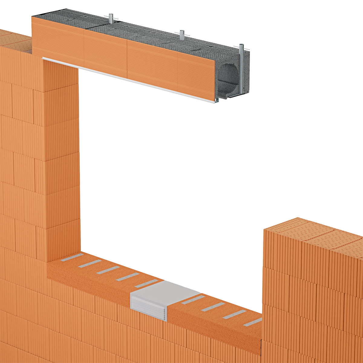 Den oberen Fensteranschluss bildet alternativ ein massiver Ziegel-Rollladenkasten bzw. Ziegel-Raffstorekasten oder ein hochstabiler Leichtbaukasten. In diesen kann optional eine Statik-Fensterkonsole mit bewegungsausgleichender Loslagerfunktion integriert werden. Dadurch wird eine vertikale Deckendurchbiegung bei großen Mauerwerksöffnungen ausgeglichen und die Gefahr von Funktionsstörungen oder Beschädigungen der Bauelemente deutlich reduziert.