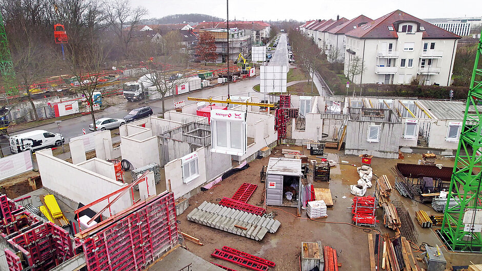 Ähnlich verlief auch der Einbau der »Windowment«-Elemente in den stetig wachsenden Rohbau der beiden Mehrfamilienhäuser. Die knapp 500 Fenstermodul-Elemente wurden passend zum Bauablauf auf die Baustelle geliefert. Unterstützt durch definierte und geprüfte Kran-Hebepunkte, wurden die Elemente von oben in die freien Fensternischen eingelassen, um anschließend die Elementdecken aufzulegen. Für eine sichere Verbindung zur Wandschale sorgte die Verschraubung von seitlichen Befestigungswinkeln ins Mauerwerk. Für Roman Hilzinger ist die Fenstermodul-Zarge von Beck + Heun eine hervorragende Lösung für Fensterbauer: »Für den bezahlbaren Wohnbau bietet ›Windowment‹ Geschwindigkeit, Ersparnisse und Prozesssicherheit durch optimierte Vorfertigung und Entfall der kleinteiligen und aufwendigen Montage vor Ort.« Weiterer positiver Effekt für Fensterbauer: Dank des erheblich reduzierten Montageaufwandes können deutlich mehr Aufträge angenommen und abgewickelt werden. Und für den Einbau der »Windowment«-Zargen vor Ort werden keine Fenstermonteure benötigt, die deshalb anderweitig eingesetzt werden können.