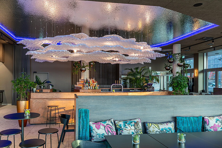 Das »Glück in Sicht Hafencity«-Restaurant lädt zum Verweilen ein und bietet nicht nur ein gutes kulinarisches Angebot, sondern auch eine besondere Atmosphäre. Julian Haug, Geschäftsleiter der Glück in Sicht Hospitality, ist überzeugt: »Die Homapal-Elemente haben es uns ermöglicht, eine beeindruckende Deckenstruktur zu schaffen, die das Thema Wasser perfekt widerspiegelt. Unsere Gäste sind begeistert von der einzigartigen Atmosphäre in der Bar.«