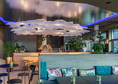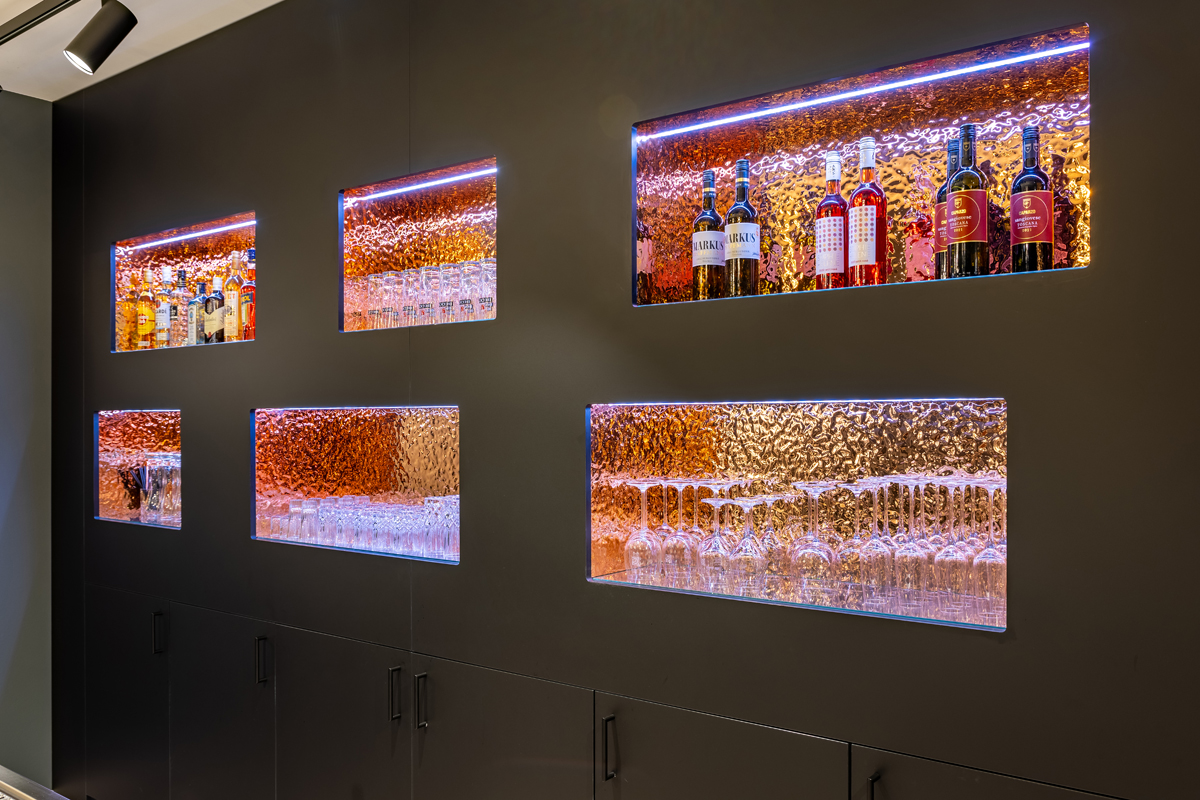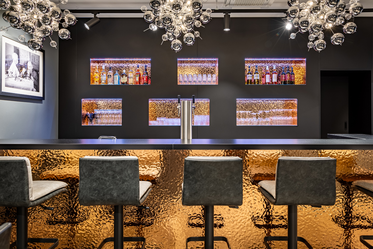 Durch die Echtmetalloberflächen von Homapal wurden in der hauseigenen Bar die Lichtreflexionen der Metalloberfläche genutzt, um lebendige und spannende Effekte zu schaffen, die sofort ins Auge fallen. Die Bar und Lounge sind exklusiv für Firmenevents und besondere Veranstaltungen vorgesehen. Als solche haben sie einen besonderen Stellenwert, der durch die Verwendung der hochwertigen Homapal -Oberflächen deutlich widergespiegelt wird.