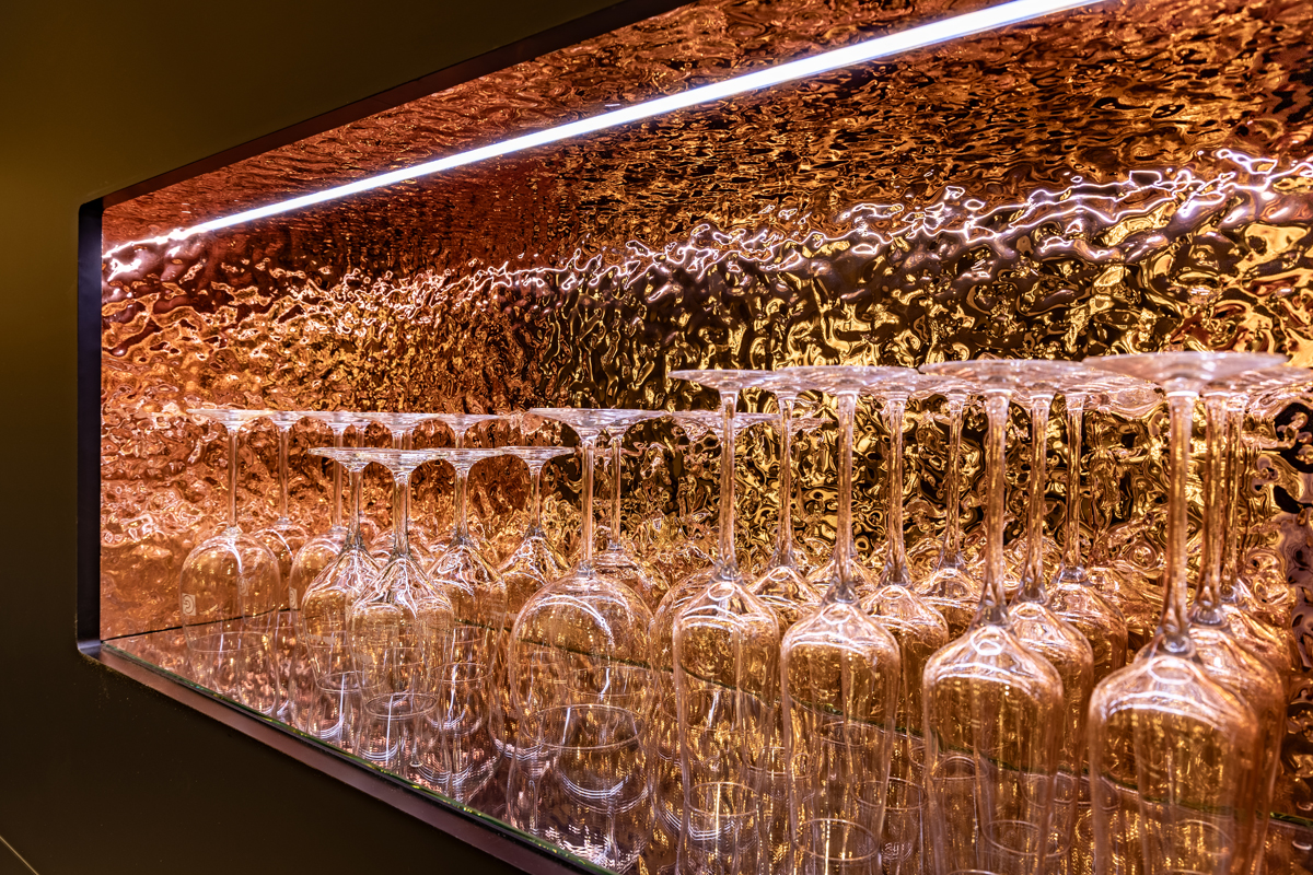 Aufgrund der guten Erfahrungen aus vorherigen Projekten entschied sich Innenarchitektin Ines Neimke-Daniels auch bei diesem Projekt für ein Echtmetalldekor von Homapal. Das Dekor »477/636 Alu-Spiegelglanz Lava Kupferton« wurde sowohl für die Tresenverkleidung als auch das Rückbuffet der Bar genutzt ebenso wie in der neugestalteten Lounge. So wurde ein gut aufeinander abgestimmtes Gesamtbild geschaffen, welches durch die glänzenden strukturierten Oberflächen einen edlen Charme in die Innenräume bringt. Mittels indirekter Beleuchtung werden die lichtreflektierenden Eigenschaften der Lavastruktur perfekt in Szene gesetzt und schaffen eine lebendige und außergewöhnliche Optik. Der Kontrast zwischen dem hellen und glänzenden Echtmetalldekor und der dunklen Tresenplatte sowie der dunklen Verkleidung des Rückbuffets machen den Bar- und Loungebereich zu einem echten Eyecatcher.