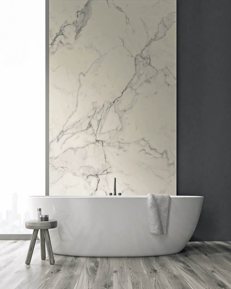 Die Dekore, sei es Marmor, Granit, Quarz, Holz oder Metall, reflektieren zeitgenössische Designtrends und bringen hochwertige, natürlich anmutende Materialien in erschwinglichem Rahmen in die Räume hinein. Authentische Eindrücke entstehen aus dem harmonischen Zusammenspiel von Optik und Haptik. Sieben verschiedene Oberflächen sorgen dafür, dass man das, was man sieht, auch fühlen kann. Alle Dekore lassen sich miteinander kombinieren und fügen sich in den Farbverbund mit der Türenexpresskollektion oder auch der Antifingerprintoberfläche »Infiniti«. Digitaldruckmotive schaffen die Voraussetzung für individuelle Atmosphäre. Verarbeiten lässt sich das nur 7,4 mm dünne Element mit den handelsüblichen Werkzeugen. Vor Ort wird das längsseitig mit Nut und Feder versehene »Aquaris Spasystem« ohne nennenswerte Trocken- und Wartezeiten einfach auf fast jeden bestehenden Untergrund geklebt. J