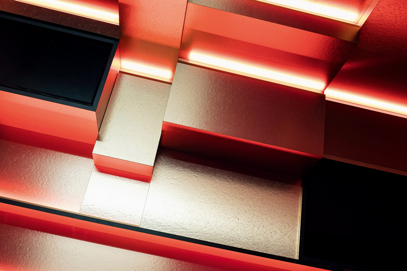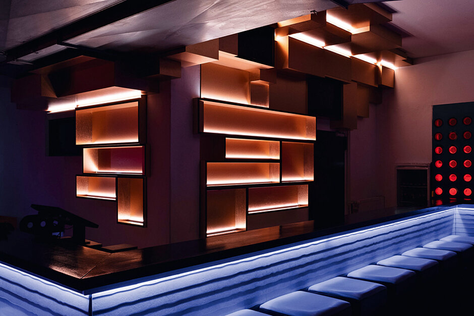 Für das ehemalige Labor des Edelfettwerks, dort wo früher geforscht und die Reinheit der Fette geprüft wurde, entwarf »uniQ« einen an die L-Form des Raumes angepassten Tresen mit einem rückseitigen Buffet. Das metallisch rot schimmernde Homapal-Dekor »630 Kupferrelief patiniert« verleiht der Rückwand nicht nur eine edle Anmutung, es steigt auch ein in ein spannend illuminiertes Wechselspiel mit der Beleuchtung und den Displays in den Fächern. Offene und geschlossene Kuben in verschiedenen Größen verdecken die kahlen Wände und die Absauganlage. Die Korpustiefe nimmt nach oben hin zu, sodass der Eindruck entsteht, die Rückwand neige sich nach vorn.