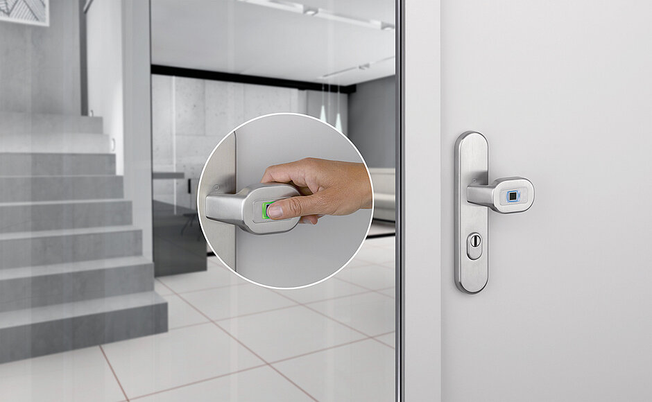 »Aufschließen« und Öffnen der Haustür können so – im Gegensatz zur Bedienung von Scannerfeldern neben der Eingangstür – durch einfaches Auflegen des Fingers auf das »FingerScan«-Modul in einer einzigen Handbewegung erfolgen. Es ist weder ein Schlüssel, eine Schlüsselkarte noch ein Zahlencode für den Zutritt erforderlich – Verlust, Vergessen oder missbräuchliche Weitergabe lassen sich damit ausschließen.