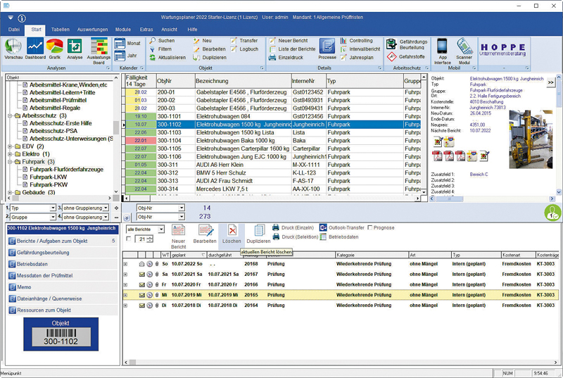 »Die Prüftermin- und Wartungsplaner-Software eignet sich besonders für die Organisation von UVV-Prüfungen, weil sie einerseits den Arbeitsaufwand im Rahmen der Prüfpflichten eines Unternehmens reduziert und andererseits Prüfberichte bei Betriebsprüfungen stets griffbereit sind«, erklärt Ulrich Hoppe, Senior Consultant der Hoppe Unternehmensberatung. Der Wartungsplaner der Hoppe Unternehmensberatung ist z. B. in den Klassifikationen Wartung, Prüfung, Reparatur, Instandsetzung sowie Prüftermin und Unterweisung unterteilt. Wichtige Instandhaltungskennzahlen werden grafisch aufbereitet und können in verschiedenen Formaten im- und exportiert werden.