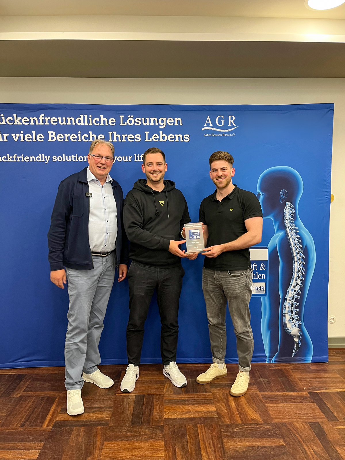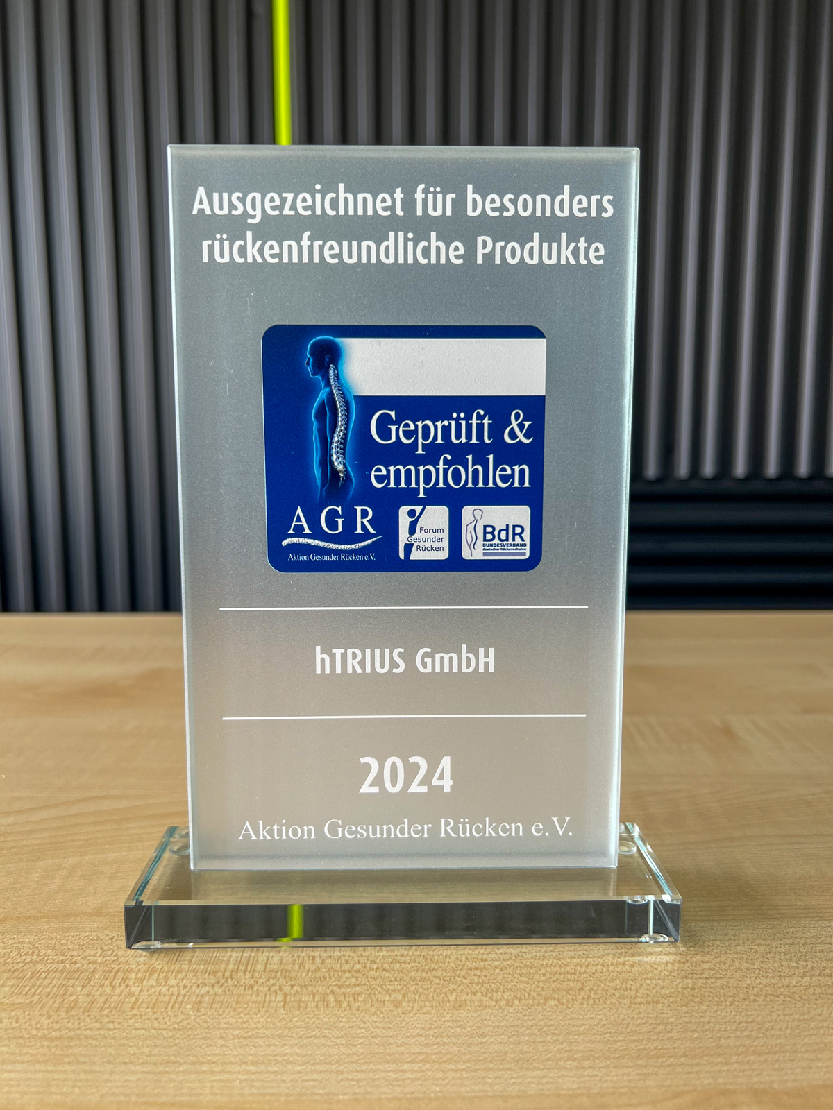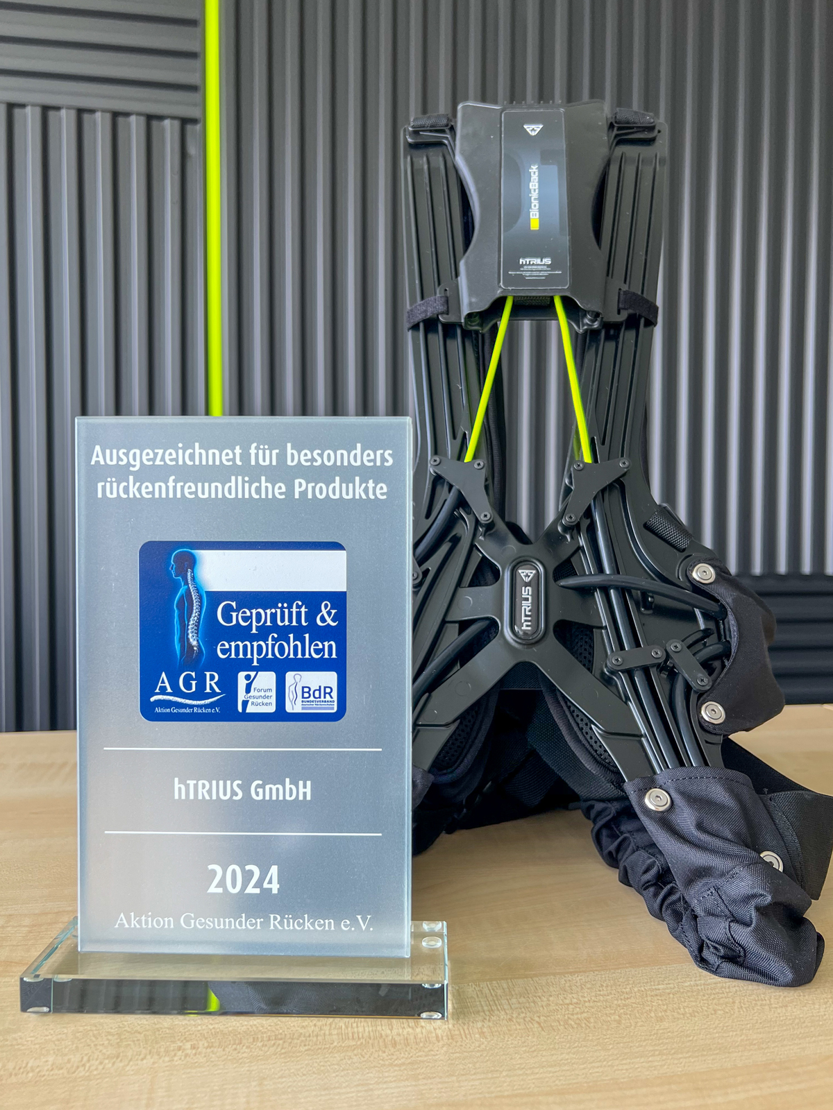 Das »BionicBack«-Exoskelett von hTrius hat als erstes Exoskelett das Gütesiegel der AGR Aktion Gesunder Rücken e. V. für besonders rückenfreundliche Produkte erhalten. Diese Auszeichnung wird nur an Produkte verliehen, die als »rückengerecht« eingestuft werden und somit die Rückengesundheit nachhaltig fördern.