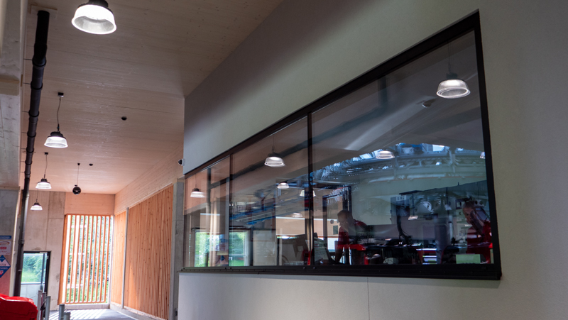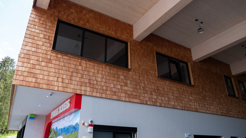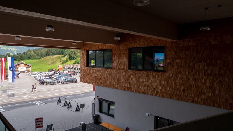 In Summe hat die österreichische Metallbau Guggenbichler GmbH für die Fenster- und Türenkonstruktionen 3.500 Laufmeter Aluminium verwertet. „Dies entspricht beinah der Streckenlänge der neuen Fleckalmbahn“, stellt Geschäftsführer Otto Guggenbichler fest. Die Ansprüche an die Neuerrichtung der Berg- und Talstationen lagen in der Ästhetik, der Funktionalität und der verantwortungsvollen Kapazität. Somit sollten die Fenster und Türen hoch funktional und belastbar sein und gleichzeitig eine schmale Silhouette und ausgezeichnete Wärmedämmwerte aufweisen. Diesen Möglichkeiten konnte der Baukasten der Fenster- und Türenserien HUECK Lambda WS/DS 075 bieten, die in der Talstation mit einer Geschossfläche von 2500m2 , sowie in der Bergstation verbaut wurden.