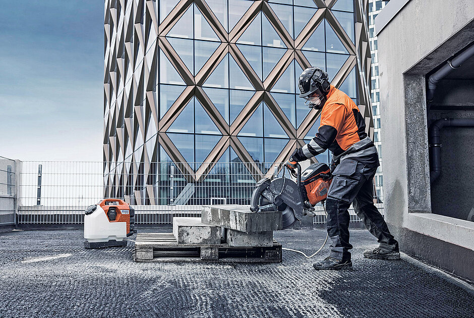 Kopf, Nacken und Brustbereich sind bei einem Kick-back des Trennschleifers besonders gefährdet. Um das Verletzungsrisiko bei Kontakt mit der Scheibe zu verringern, umfasst das neue »SmartGuard«-System von Husqvarna eine verstärkte, bequeme Jacke sowie einen robusten, aber dennoch leichten Helm. Die »SmartGuard«-Jacke ist für höheren Schutz im Nacken- und Brustbereich aus mehrlagigem Gewebe gefertigt, der Kragen dabei zusätzlich verlängert. Gleichzeitig bietet die gute Passform höchsten Komfort sowie optimale Bewegungsfreiheit und unterstützt so das effiziente Arbeiten mit dem Trennschleifer. Die in den Größen S bis XXL erhältliche »SmartGuard«-Jacke ist mit abnehmbaren Ärmeln, funktionellen Taschen und Belüftung ausgestattet, die Sichtbarkeit entspricht EN20471 Klasse 2. Der »SmartGuard«-Helm wurde für den besonderen Schutz von Gesicht und Kopf konstruiert: Im Falle eines Kick-back-Unfalls verringert der spezielle Kinnschutz schwere Verletzungen durch die rotierende Trennscheibe. Der in Weiß oder Anthrazit angebotene Helm verfügt außerdem über ein Visier sowie einen Gehörschutz und bietet ausreichend Platz, um darunter eine Staubschutzmaske, Brille oder persönlichen Augenschutz zu tragen. Kinnschutz, Visier und Gehörschutz sind für die Anpassung an verschiedene Arbeitssituationen leicht abnehmbar.