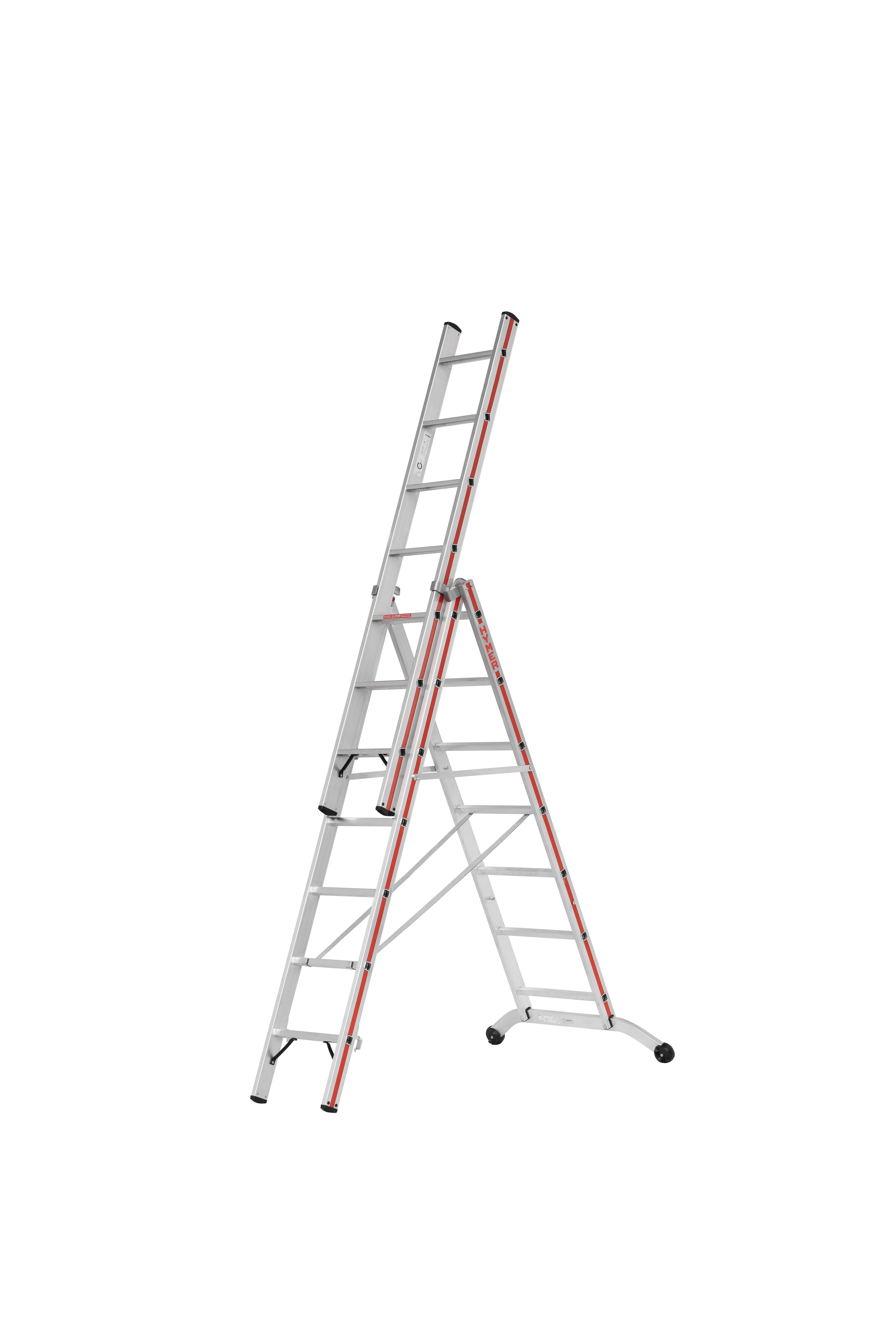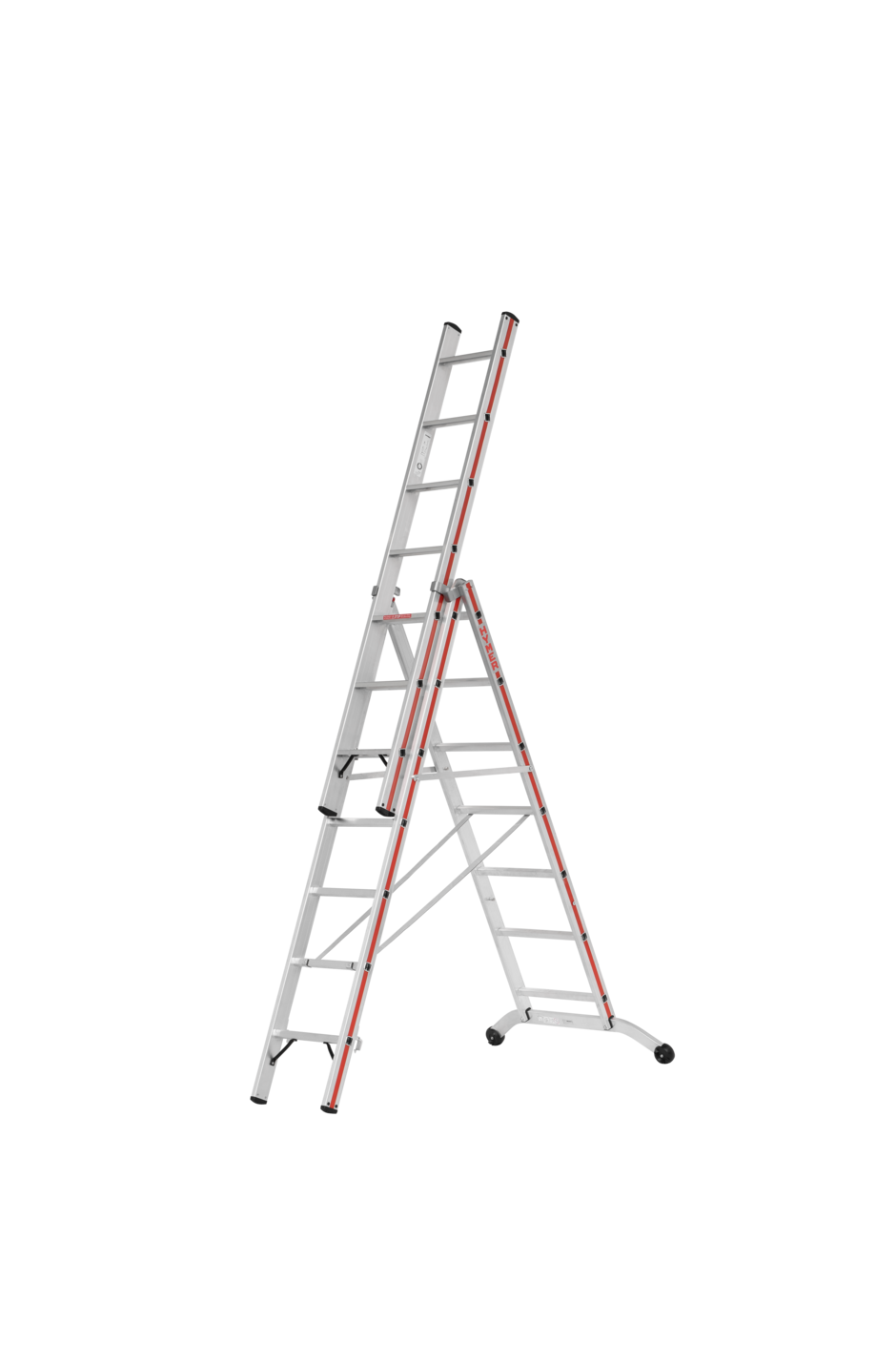 Das obere Leiterteil verfügt über 80 mm tiefe Stufen und soll dadurch ergonomisches und sicheres Arbeiten ermöglichen. An den anderen beiden Leiterteilen wurden die Sprossen noch stärker profiliert, um ein unbeabsichtigtes Abrutschen zu vermeiden. Die mit dem Holm verschraubten Leiterfüße dienen ebenso einem sicheren Stand und komfortablen Arbeiten. Aufgrund der Wandlaufrollen (ab Stufen-/Sprossenzahl 3 x 8) lasse sich das obere Leiterteil besonders leicht nach oben ausfahren. Das spare Zeit beim Auf- und Abbau. Außerdem schonen die Laufrollen Wand- und Fassadenflächen, da beim Ausfahren kaum Beschädigungen entstehen können. „Stufenmehrzweckleitern werden in allen Bereichen gebraucht. Gerade im Handwerk oder im Gebäudemanagement sind sie aber sehr beliebt, da sie schnell einsatzbereit sind und für jeden erdenklichen Zweck eingesetzt werden können“, so Christian Frei.