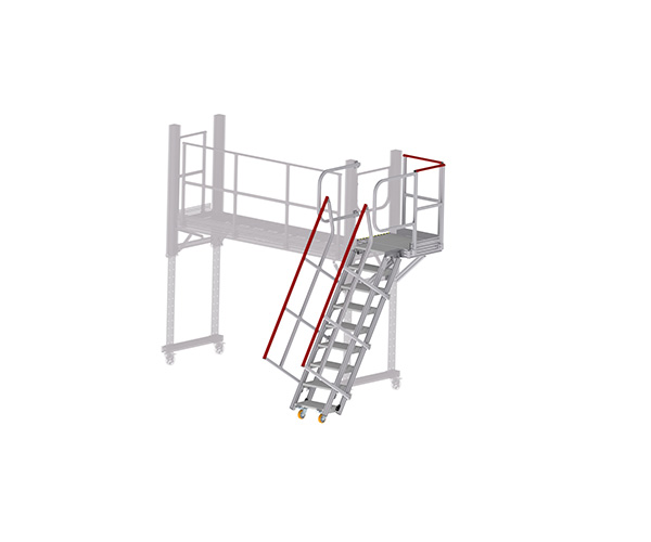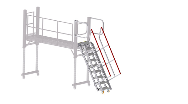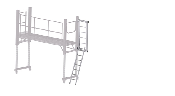 Der Zustieg zur Bühne erfolgt über drei verschiedene Varianten: via Leiter, Vierholmtreppe oder auch per Vierholmtreppe mit integrierter Plattform. Die Multi-Arbeitsbühne passt sich somit mühelos den individuellen Anforderungen und Gegebenheiten wie etwa dem Hallen-Layout an. „Der Leiterzustieg ist geradezu prädestiniert für den Einsatz in der Werkstatt, wo mitunter wenig Platz vorhanden ist“, erklärt Thomas Casper die Vorteile der Konfiguration aus Alu- Leiterrahmen und Alu-Einhängeleiter. Der Zustieg via Leiter erfolgt von der Stirnseite her auf 80 mm tiefen Stufen. Die Innenbreite der Leiter bietet mit 35 cm viel Freiraum und somit auch maximale Standsicherheit. Ebenfalls von der Stirnseite her lässt sich die Arbeitsbühne auch über eine Vierholmtreppe betreten – wahlweise ohne Erweiterungspodest oder mit Podest und Treppe in platzsparender L-Form. Die Vierholmtreppe passt sich automatisch an die Höhe der Arbeitsbühne an (ca. 19°-59°) und verfügt an beiden Seiten über ein Geländer. Die Stufen sind 30 cm tief und ebenfalls mit rutschfestem Belag versehen (gerieft seine Tätigkeiten auf der Arbeitsbühne benötigt oder einen schweren Werkzeugkoffer zu tragen hat, ist auf diesen Stufen natürlich agiler und vor allem auch sicherer unterwegs“, weiß Thomas Casper und ergänzt: „Im Arbeitsalltag drängt oftmals die Zeit und genau in solchen Situationen minimieren wir Unfallgefahren durch stabile und sichere Steigtechnik.“
