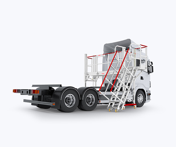 „Mit unserer modular konfigurierbaren Multi-Arbeitsbühne haben wir seit neuestem einen echten Allrounder im Sortiment“, betont Thomas Casper, Vertriebsleiter Steigtechnik D/A/CH bei HYMER-Steigtechnik. Die Bühne eignet sich für sämtliche Arbeiten an der LKW-Zugmaschine, vom Scheiben wechseln vorne am LKW, über die Wartung der Klimaanlage, bis hin zu sämtlichen Reparaturen oder Wartungen im hydraulischen Bereich rückseitig der Zugmaschine. Aber auch turnusmäßige Wartungsarbeiten an Maschinen und Anlagen in Industrieunternehmen sind damit möglich. „Die Multi- Arbeitsbühne ermöglicht trotz einer Vielzahl unterschiedlicher Einsatzgebiete einen absolut sicheren und ergonomischen Stand“, so Thomas Casper.