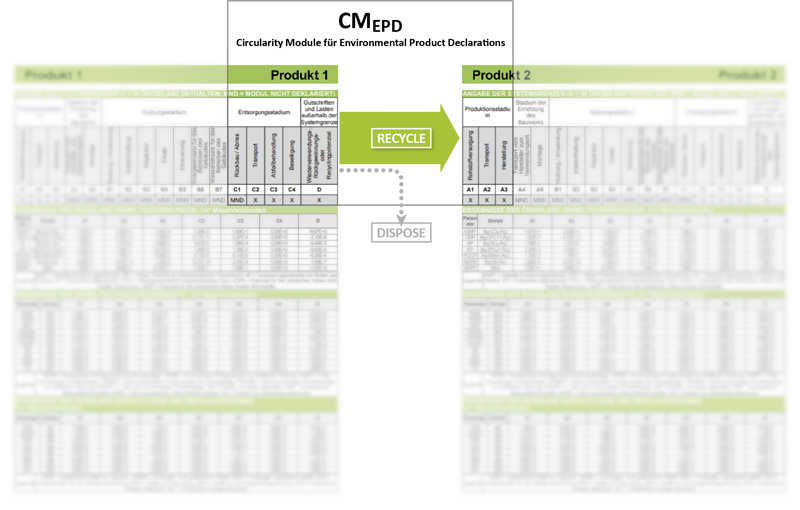 Dies ändert sich mit dem »Circularity Module«. CMEPD werden in Zusammenarbeit mit Ökobilanzierern erstellt und basieren auf Daten von Recycling- und Entsorgungsunternehmen. Sie enthalten konkrete Angaben zum Recycling bestimmter Produktgruppen und Materialtypen und liefern den Produktherstellern damit die für die EPD-Erstellung benötigten Ökobilanzergebnisse für die verschiedenen End-of-Life-Prozesse. Damit ein EPD-Ersteller das passende Szenario für sein Produkt wählen kann, werden außerdem Annahmebedingungen für Reststoffe sowie Informationen zur ordnungsgemäßen Installation beschrieben. So zeigt die CMEPD, wie ein Bauprodukt nach dessen Ausbau verwertet oder entsorgt wird, und ermöglichen damit die recyclinggerechte Planung und Realisierung von Gebäuden sowie deren vollständige ökologische Bewertung. CMEPD liefern darüber hinaus die Ökobilanzdaten für Sekundärrohstoffe.