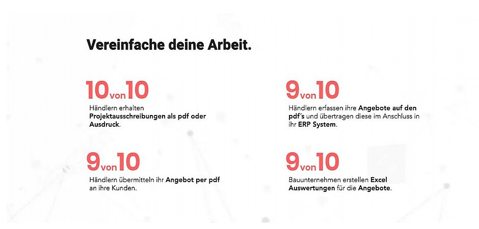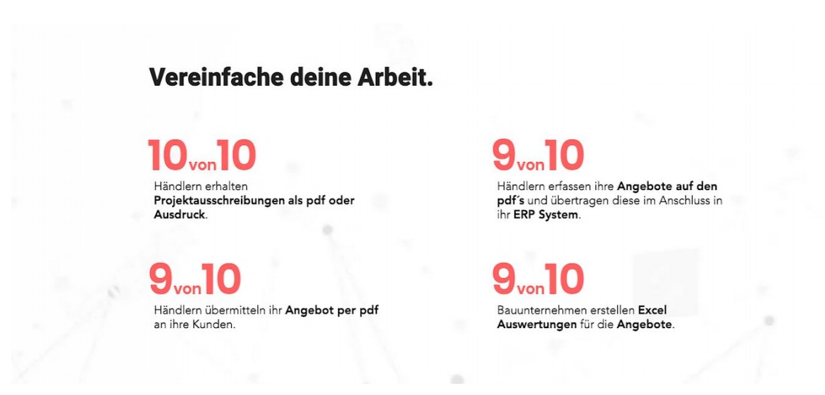 Aktuell werden Ausschreibungen zu Bauprojekten überwiegend per PDF versendet und dann manuell bearbeitet. Artikel, Preise und Konditionen werden in PDF´s eingetragen und in EDV-Systemen erfaßt. Preisübersichten werden in Excel Tabellen erstellt. All das geht nun nicht nur schneller und einfacher, sondern auch günstiger.
