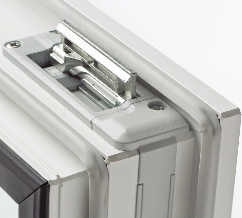 Das Beschlagsystem benötigt keine sichtbaren Schließteile am Rahmen, die Verbindung der Verriegelungsklappen erfolgt unsichtbar in den Hohlkammern des Flügelprofils. Das hat auch Vorteile für die Reinigung des Flügels: Die wenigen Teile stehen kaum vor und zwischen den Teilen befindet sich die glatte, pflegeleichte Kunststoffoberfläche des Profils. Gehalten wird das Fenster von einem Viergelenklager unten und einem Scherenlager oben. Die neuartige Konstruktion der Lagerteile ermöglicht Flügelgewichte bis 130 kg.