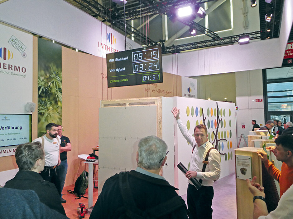 Der baustoffPARTNER war dabei und hat mit Blick auf die schnelle Verarbeitbarkeit ganz genau auf die Uhr geschaut. Viermal täglich trat das Montageteam von Inthermo an und hat dem Fachpublikum gezeigt, wie leicht die neuentwickelte VHF (vorgehängte hinterlüftete Fassade) zu verarbeiten ist.
